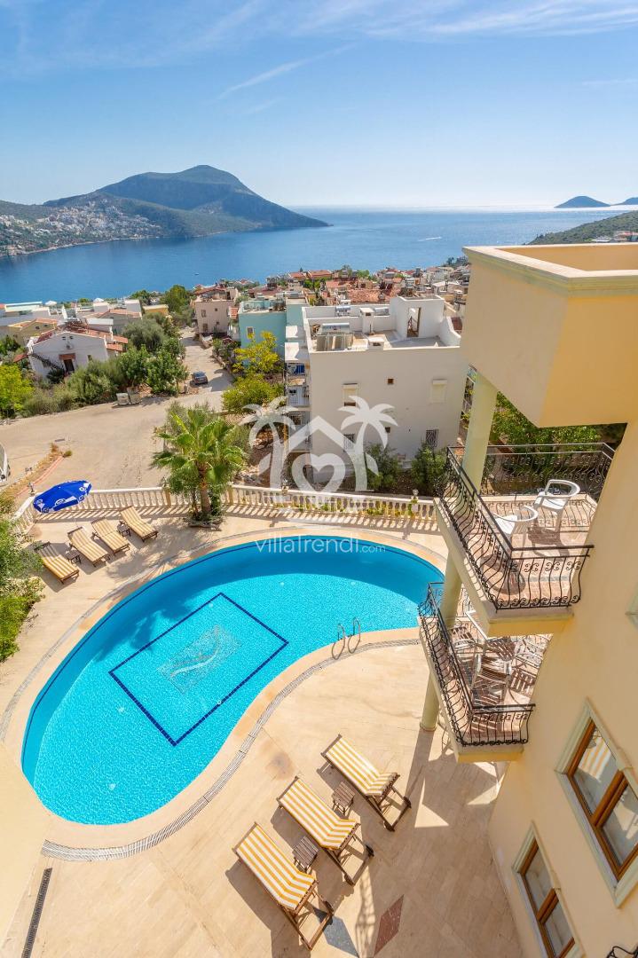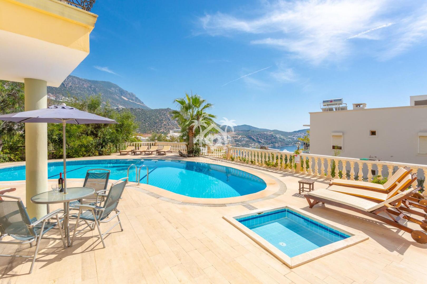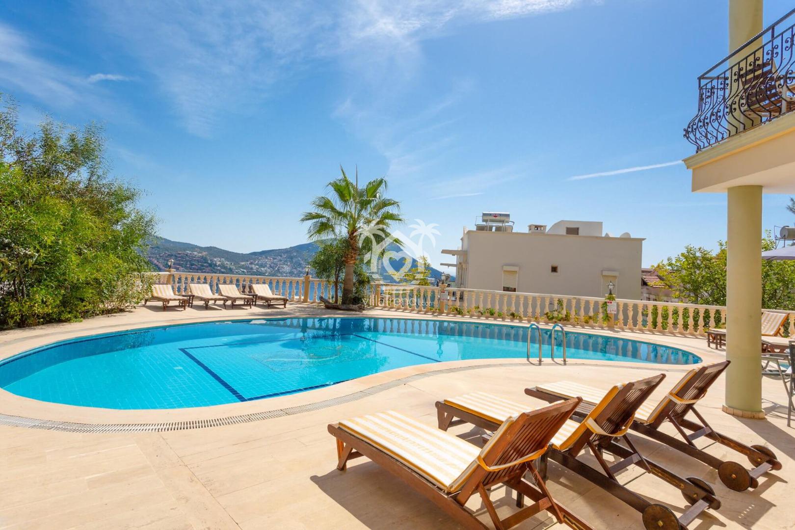 Çocuk havuzu: 1.50m x 1.50m; Derinlik 60cm Havuzdan Kalkan limanı manzarası.Salon doğrudan size ait havuz kenarındaki özel verandanıza açılmaktadır.