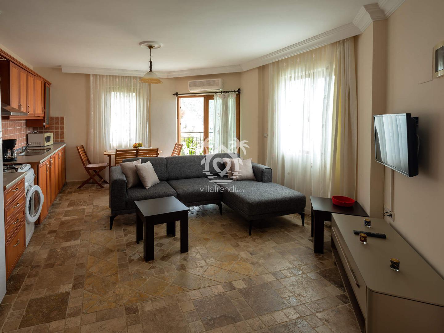 Klimalı oturma odasında kanepeler, Wi-Fi internet ve yemek alanı mevcuttur. Havuz terasına açılan veranda kapıları vardır.