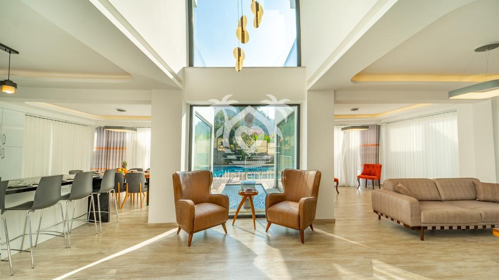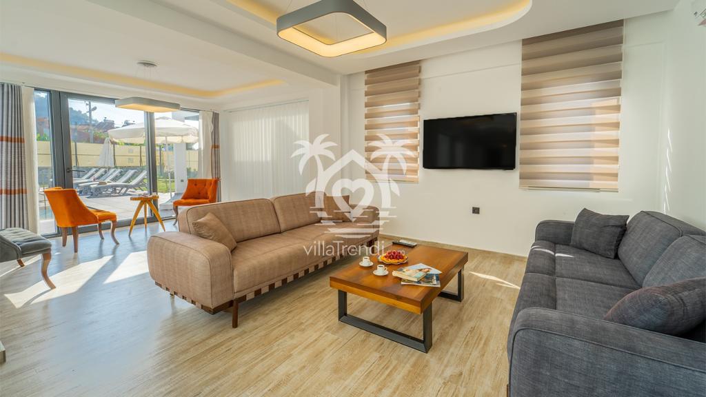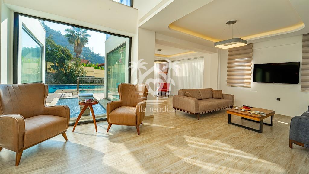 Geniş Salon: Konforlu oturma grubu, TV ve klima ile donatılmış salondan doğrudan havuz terasına çıkış imkanı.