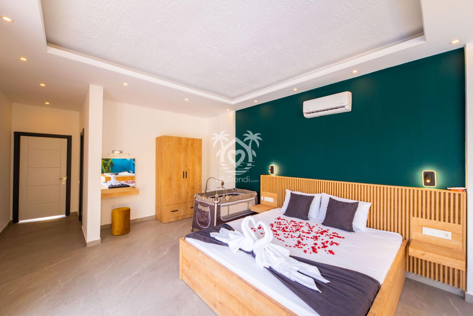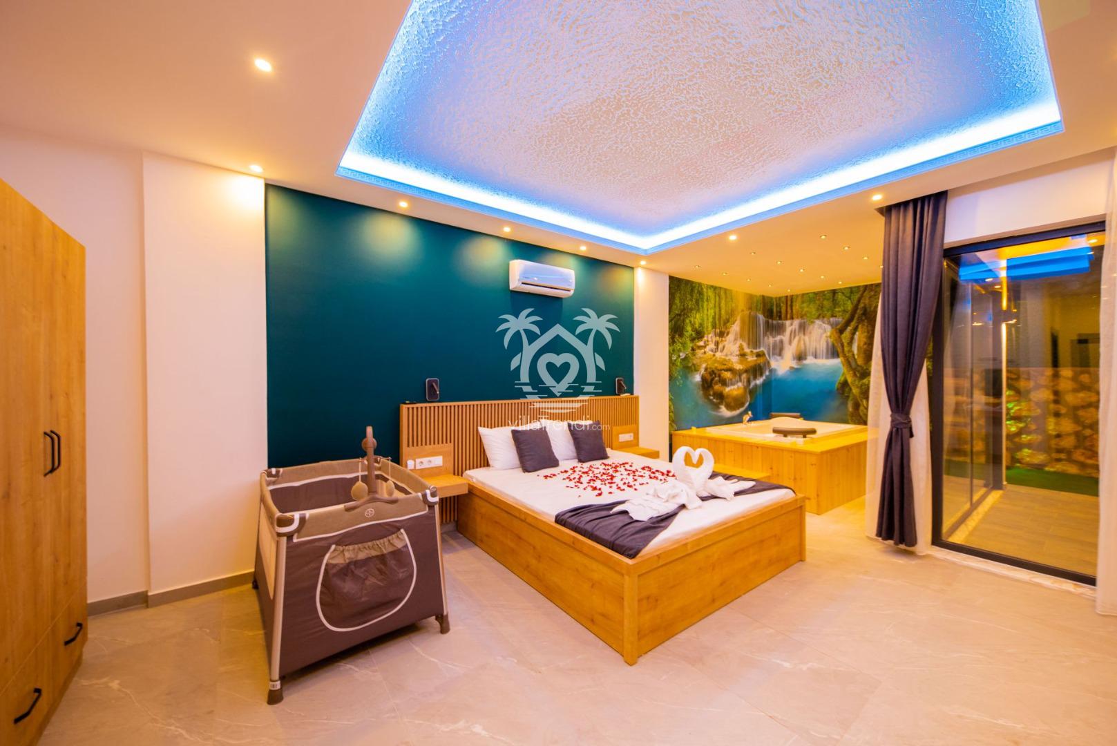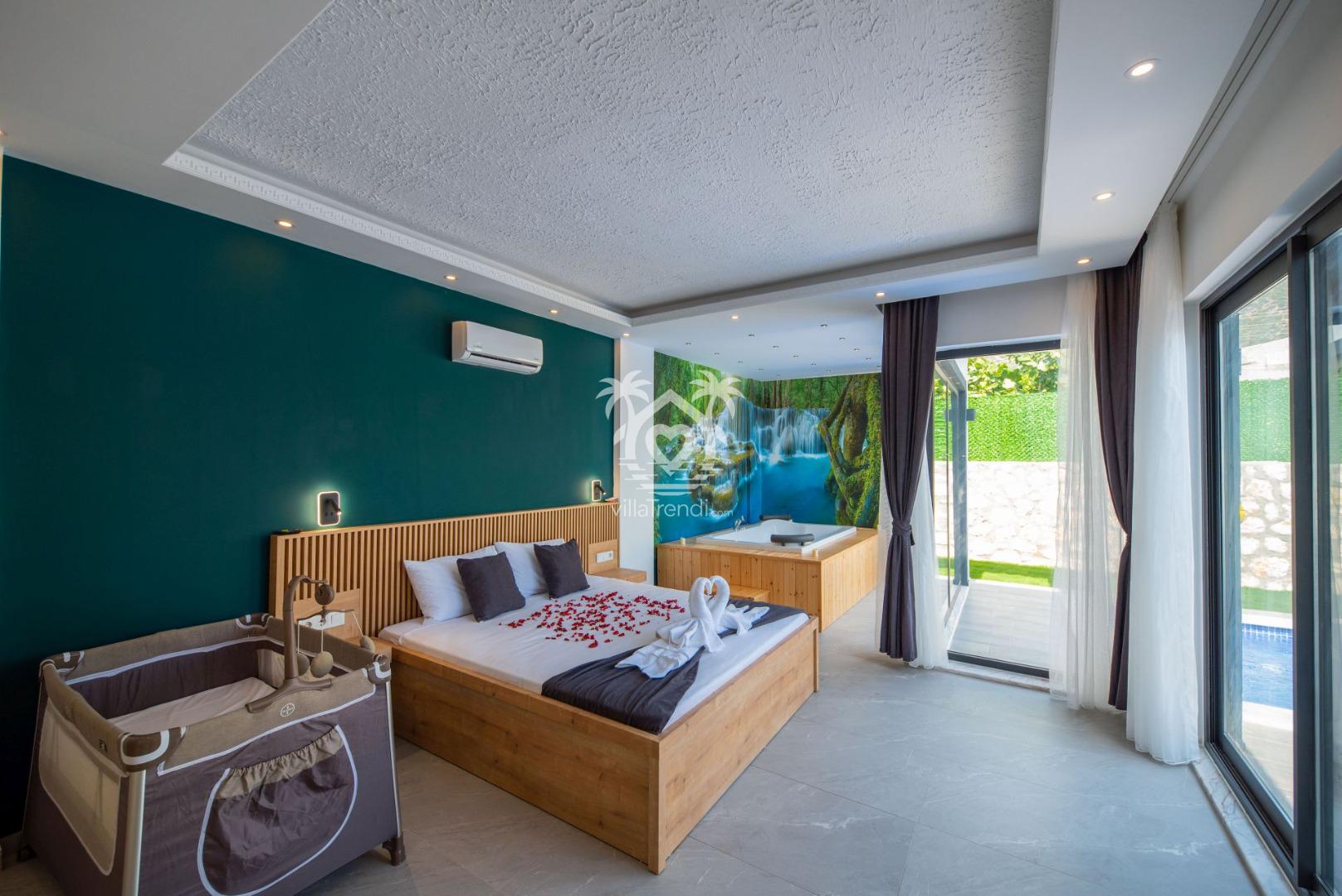 1. Yatak Odası: Çift kişilik yatak, jakuzi, bebek yatağı ve havuz terasına doğrudan çıkış imkanı sunan tam donanımlı ebeveyn odasıdır.
