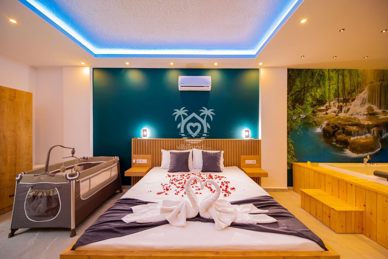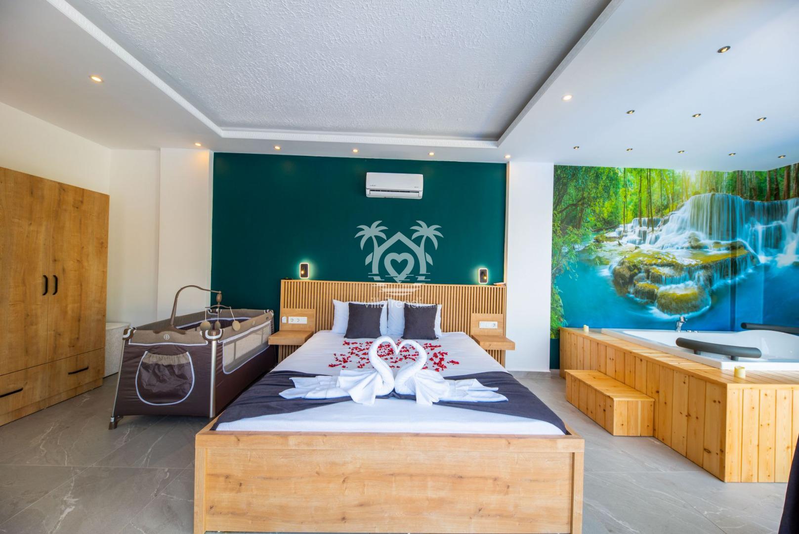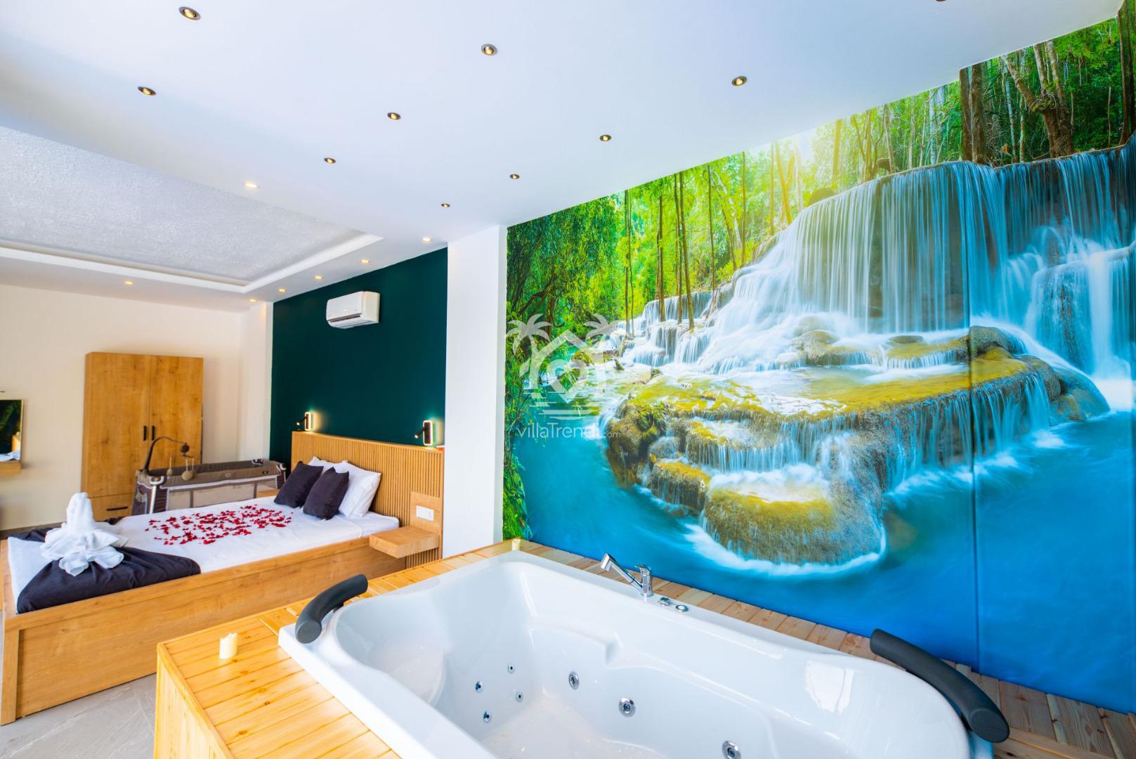 1. Yatak Odası: Çift kişilik yatak, jakuzi, bebek yatağı ve havuz terasına doğrudan çıkış imkanı sunan tam donanımlı ebeveyn odasıdır.