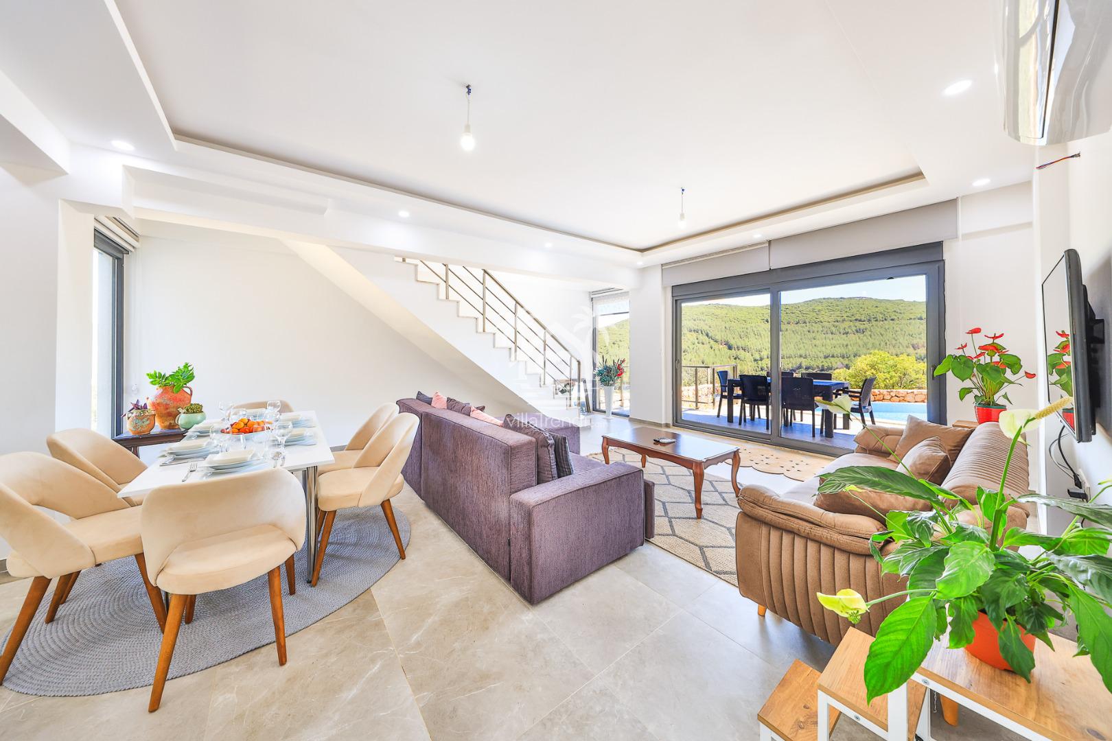 - Salon: Geniş ve ferah bir salona sahiptir. Rahat oturma grubu, düz ekran TV, uydu yayını, klima ve çekyatlar (2 kişilik konaklama imkanı sunar) bulunur. Bahçeye veya havuz alanına kolay erişim sağlayabilir. Doğa manzarasına hakim olabilir.