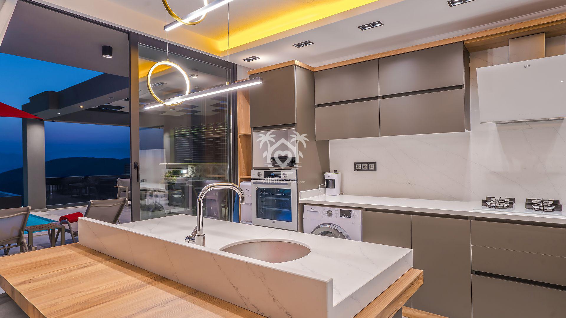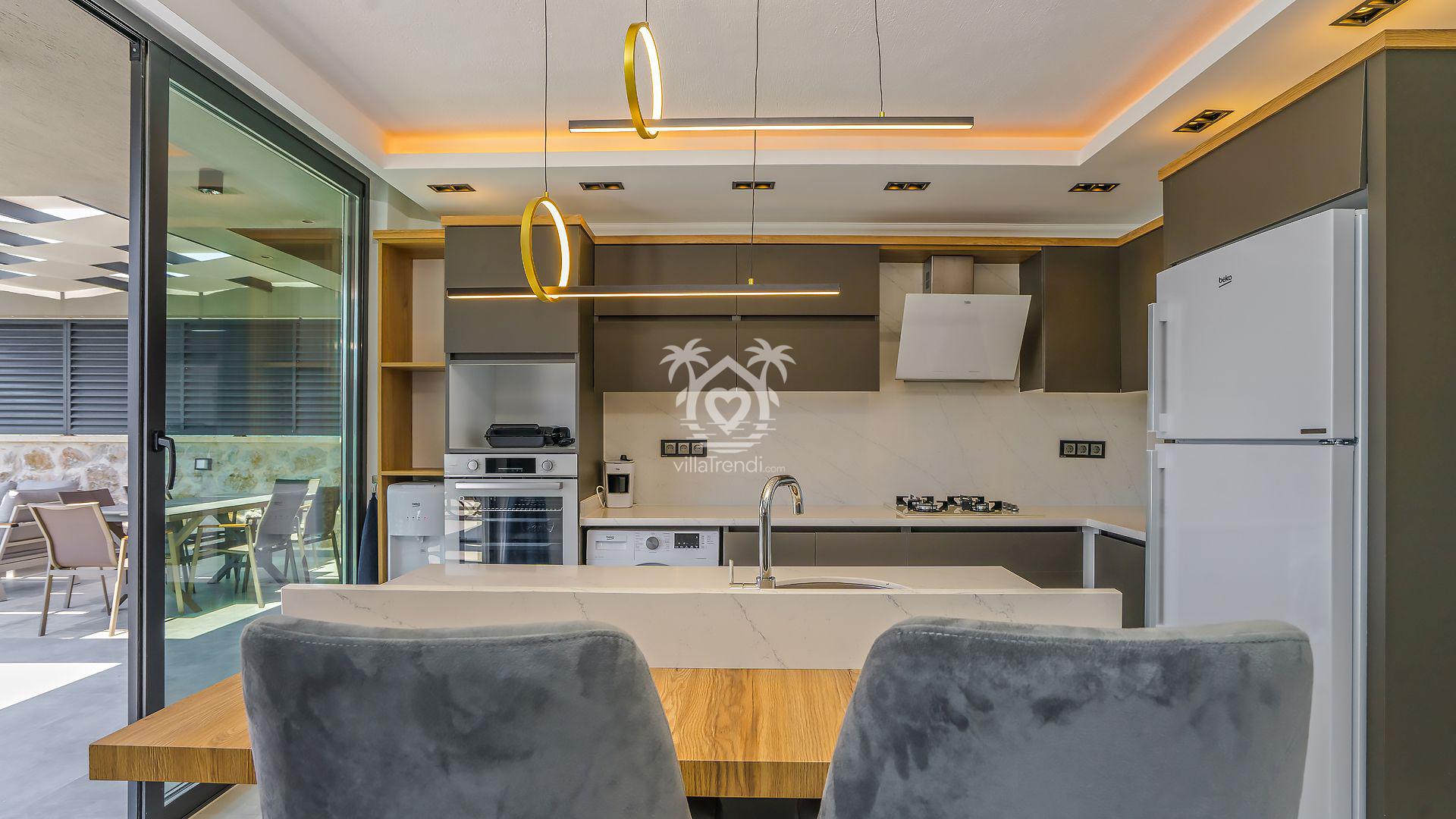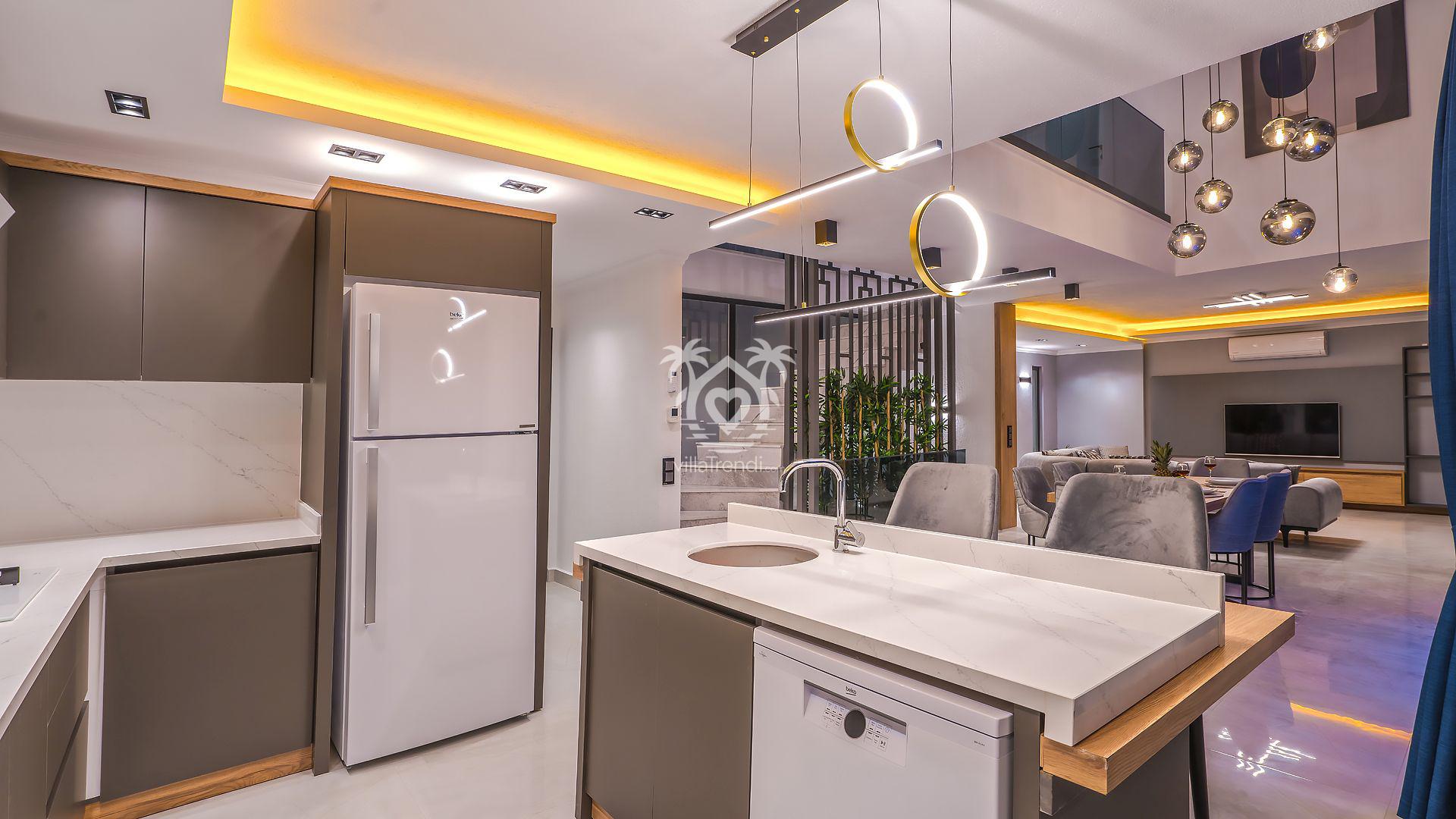 Açık Mutfak & Salon: Rahatlık ve lüksün ön planda tutulduğu salondan doğrudan havuz terasına çıkış yapabilirsiniz. Modern Amerikan mutfakta buzdolabından çamaşır makinesine kadar her detay mevcuttur. 🛋️🍳