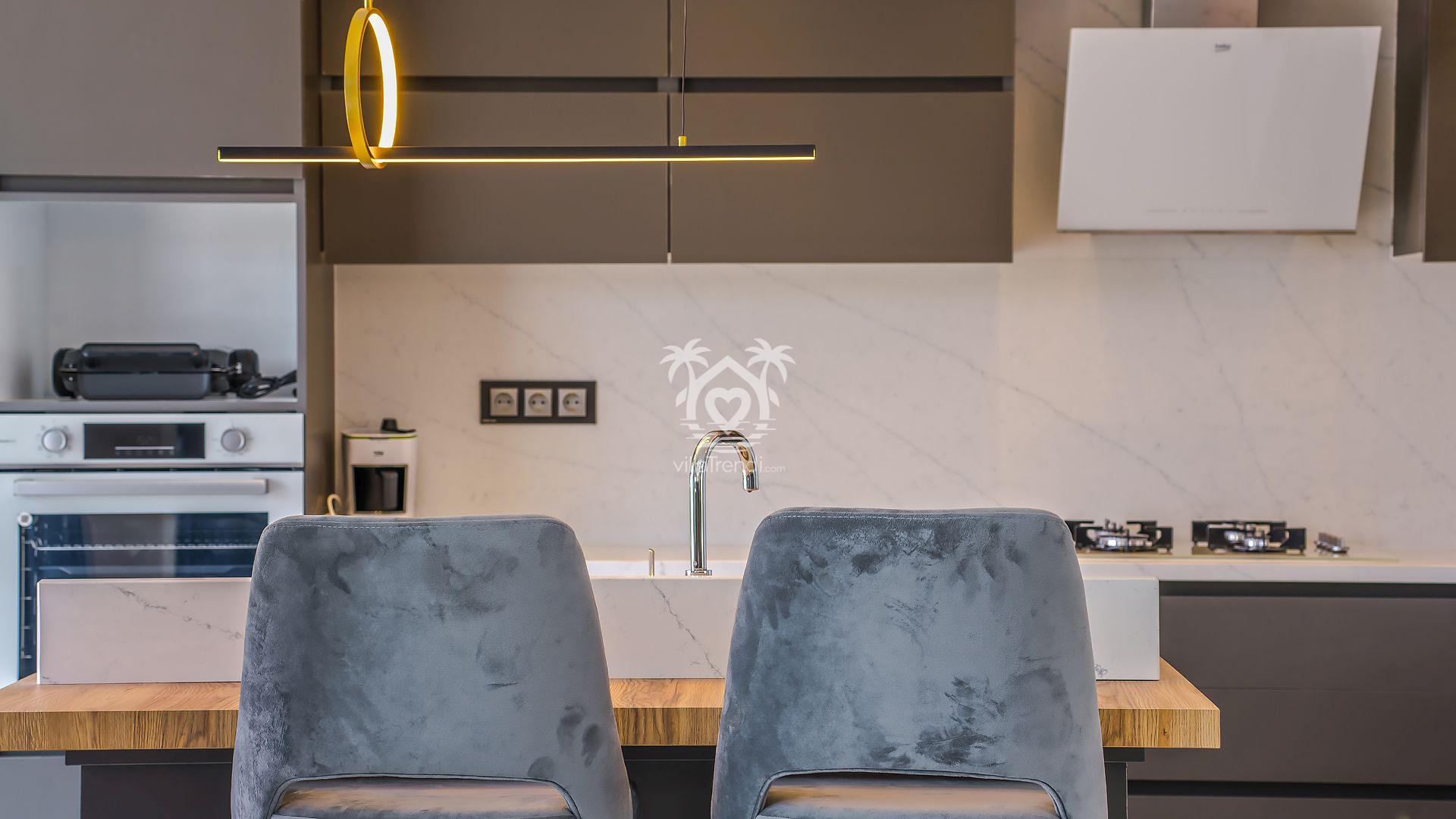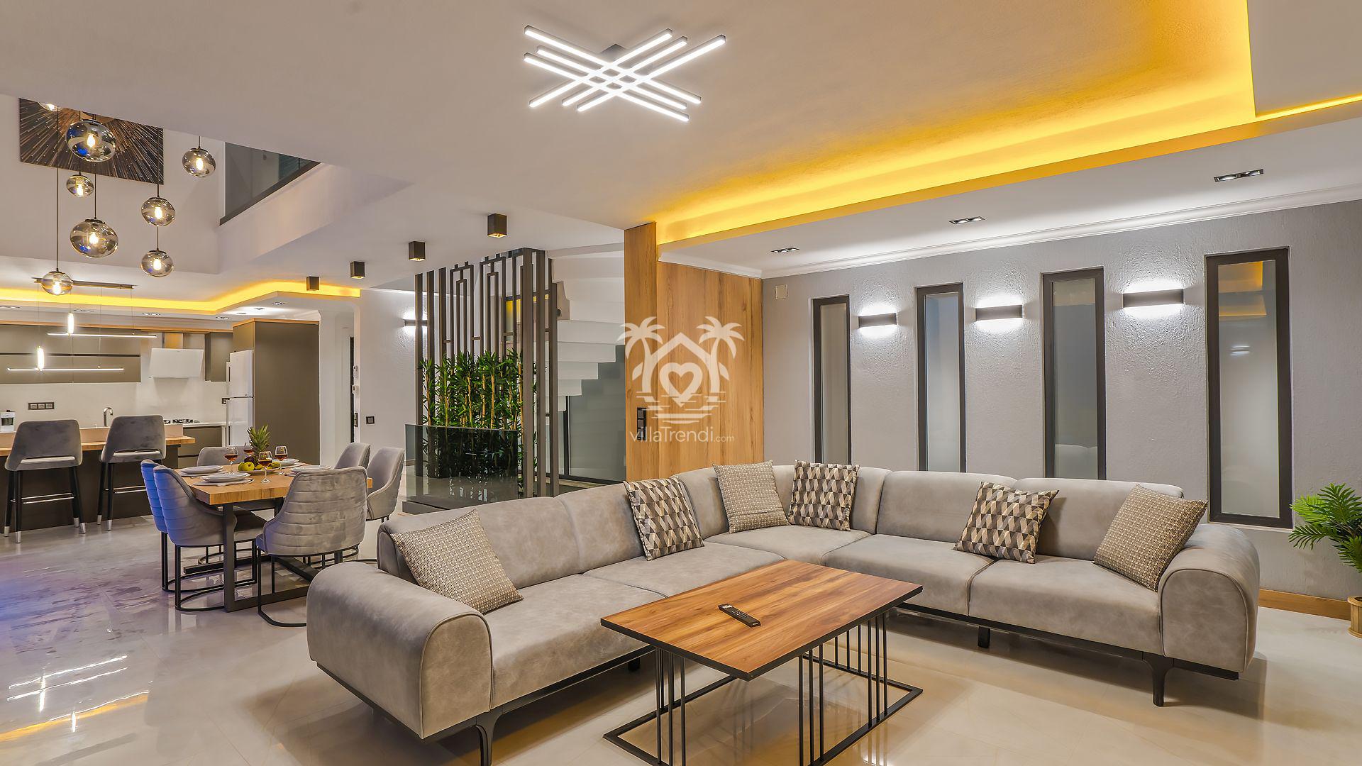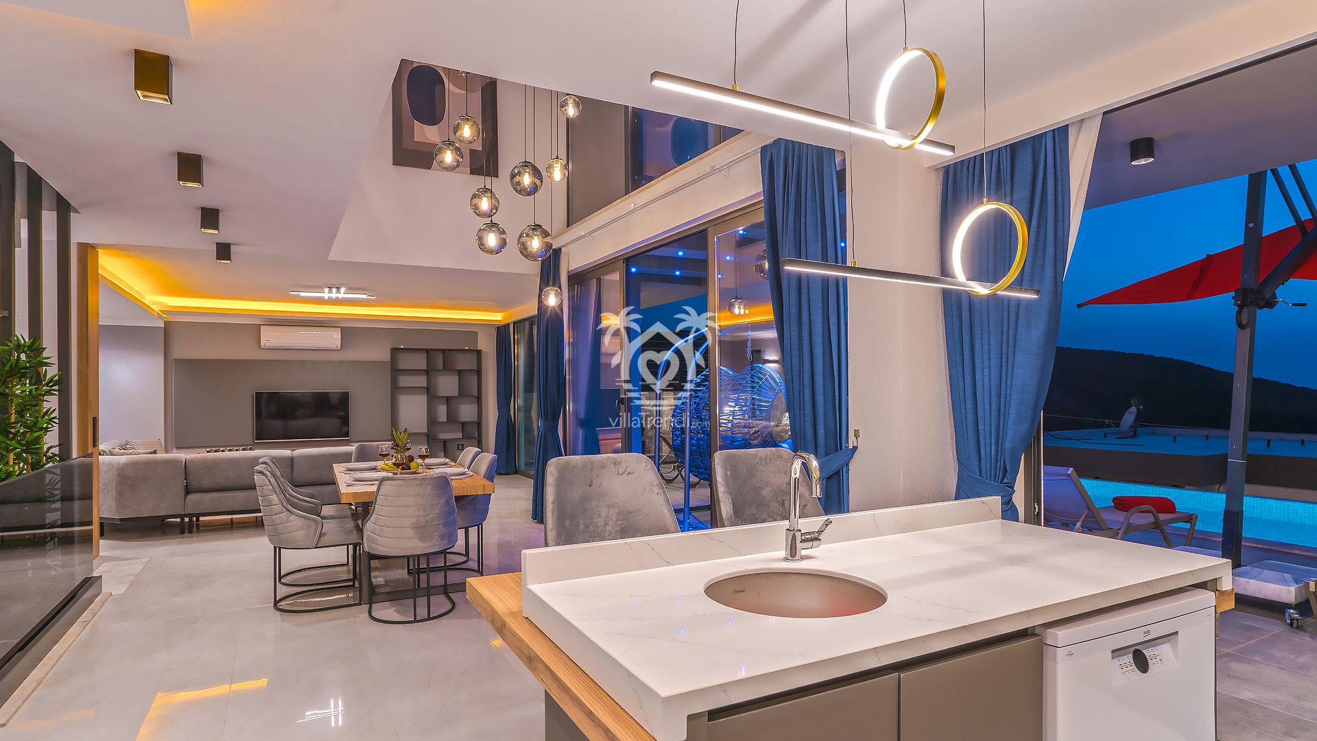 Açık Mutfak & Salon: Rahatlık ve lüksün ön planda tutulduğu salondan doğrudan havuz terasına çıkış yapabilirsiniz. Modern Amerikan mutfakta buzdolabından çamaşır makinesine kadar her detay mevcuttur. 🛋️🍳