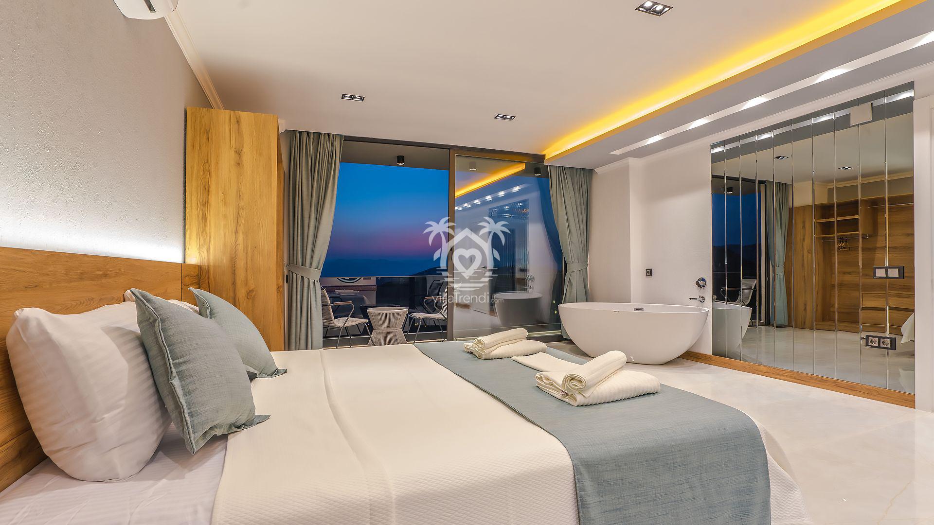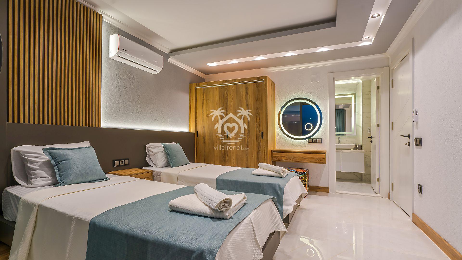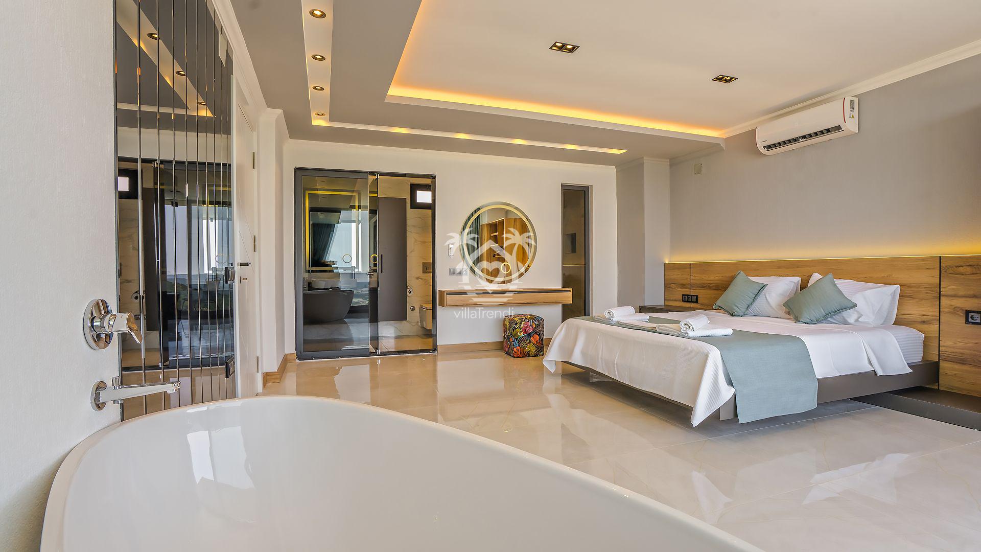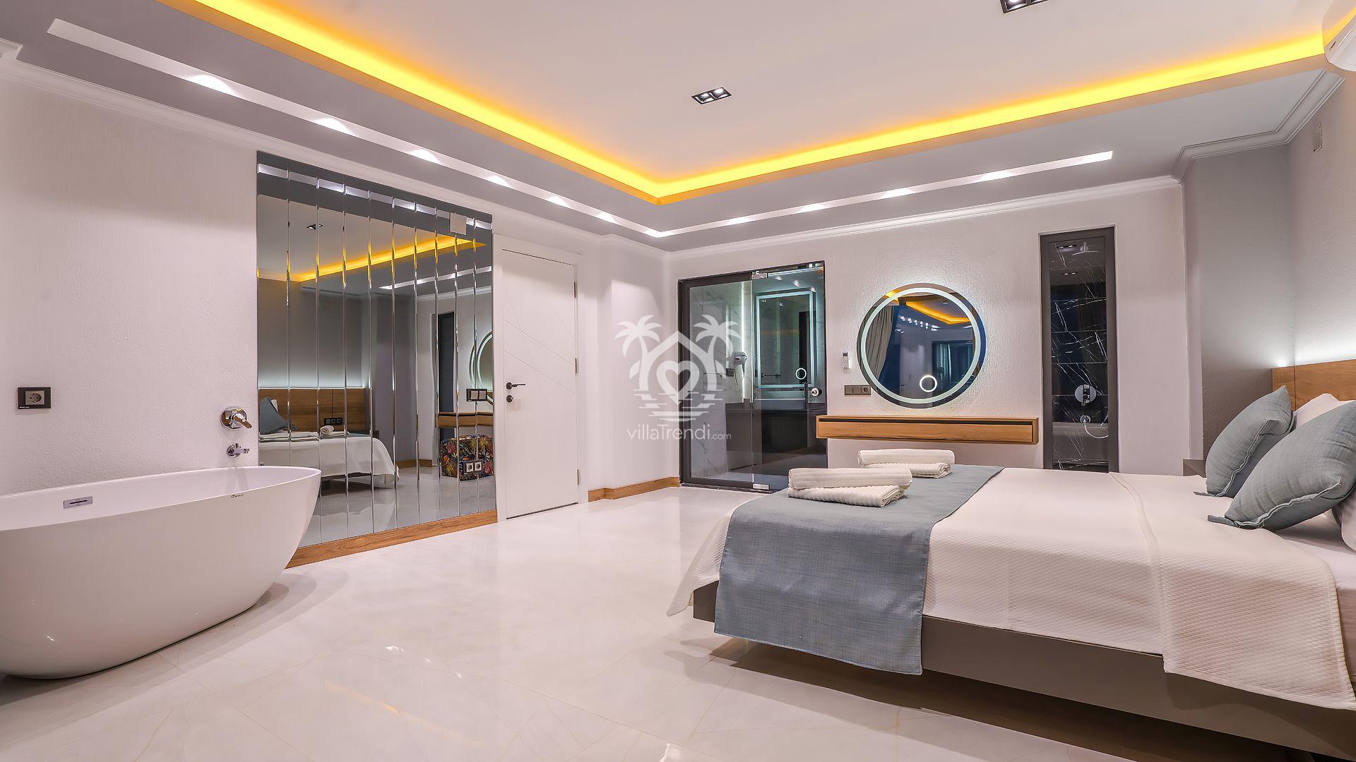 Süit Odalar: Villamızda 2 adet çift kişilik ve 1 adet iki tek kişilik yataklı oda bulunmaktadır. Birinci yatak odasındaki özel küvet detayı ise konforunuzu taçlandırıyor. 🛌🛀