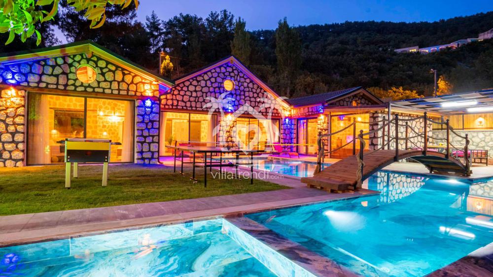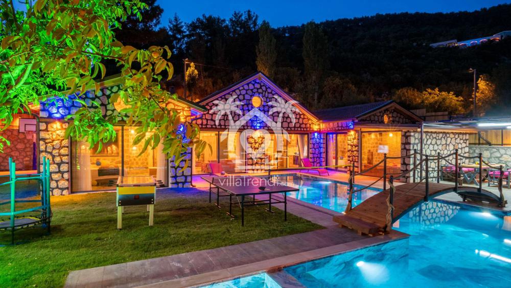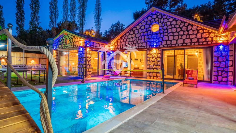Villanın havuzu tam bir keyif alanı: Geniş havuzun üstündeki ahşap köprü romantik bir ambiyans yaratıyor. Ayrıca havuzdaki eğlenceyi arttırmak için voleybol filesi hazır bulunuyor. Havuzda eğlendikten sonra rahat şezlonglarda dinlenebilir, güneşlenebilirsiniz. Bahçedeki langırt masası, masa tenisi, basketbol – futbol alanı balayı tatilinizde çokça eğleneceğinizi işaret ediyor.