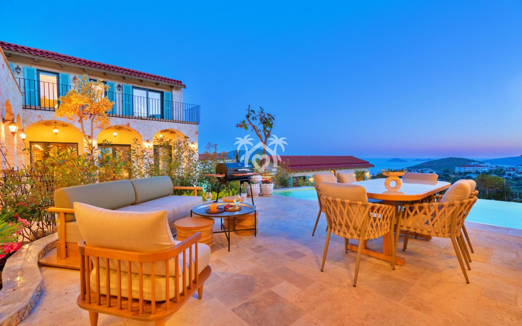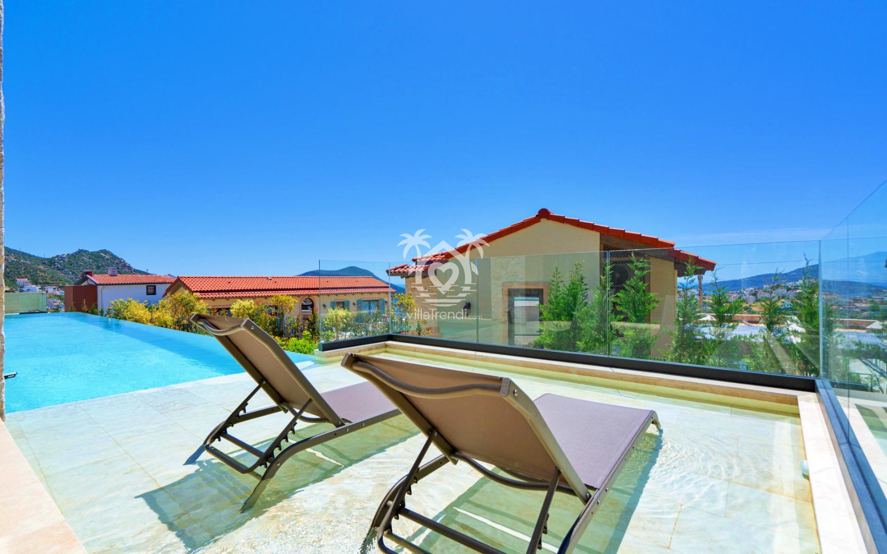 Yıldızların Altında: Havuz başındaki şezlonglarda gündüz güneşin, gece ise su sesleri eşliğinde Kalkan gökyüzündeki yıldızların tadını çıkarın. 🌌✨
