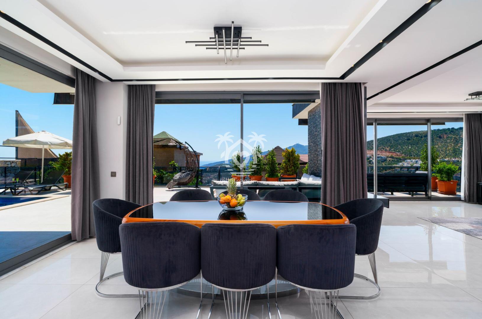 Salon: Modern çizgilerle döşenmiş, deniz manzarasına açılan ferah salonumuzda; şık bir oturma grubu, klima, LCD TV ve uydu alıcısı yer almaktadır. Salonunuzdan havuz terasına doğrudan geçiş yapabilirsiniz.