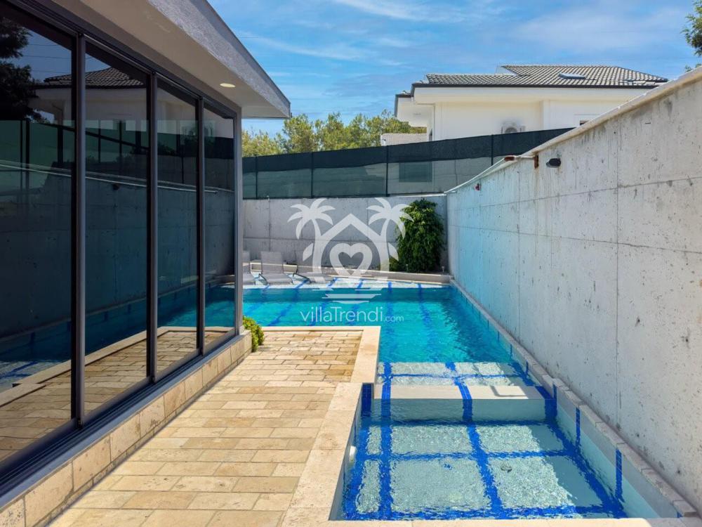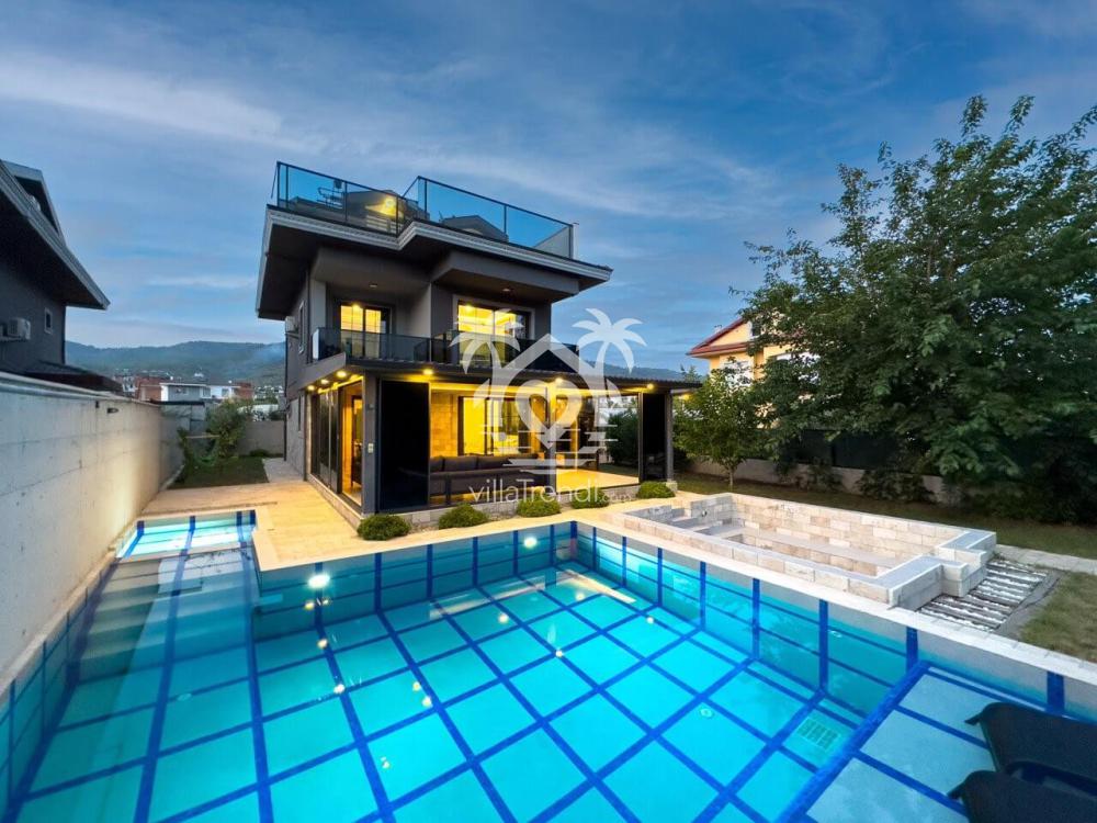 - Villa bahçesinin merkezinde şık ve geniş bir yüzme havuzu