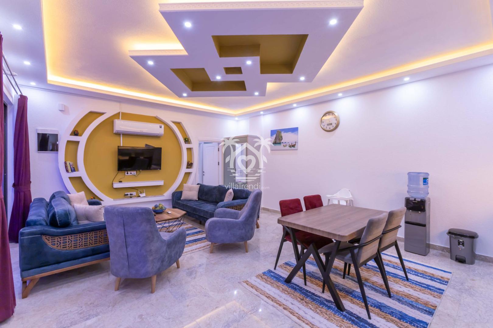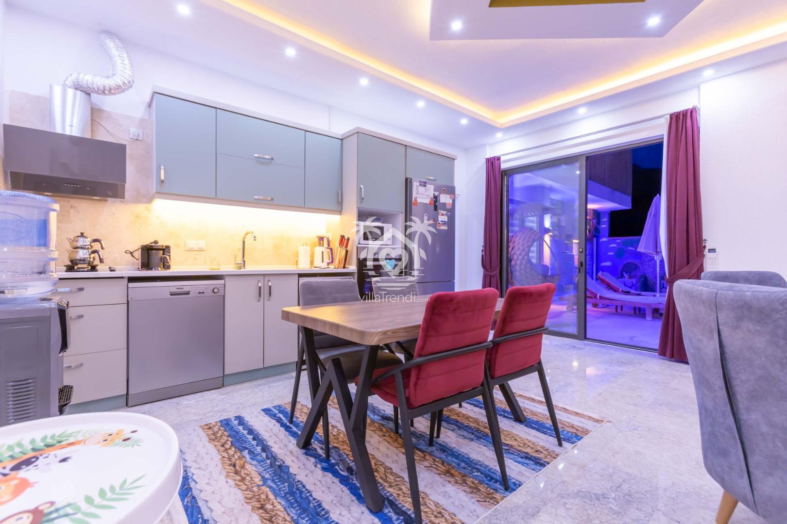 Ferah İç Mekan: Modern oturma grubu ve 4 kişilik yemek masasıyla donatılmış salondan havuz terasına doğrudan geçiş yapabilirsiniz. 🛋️📺
