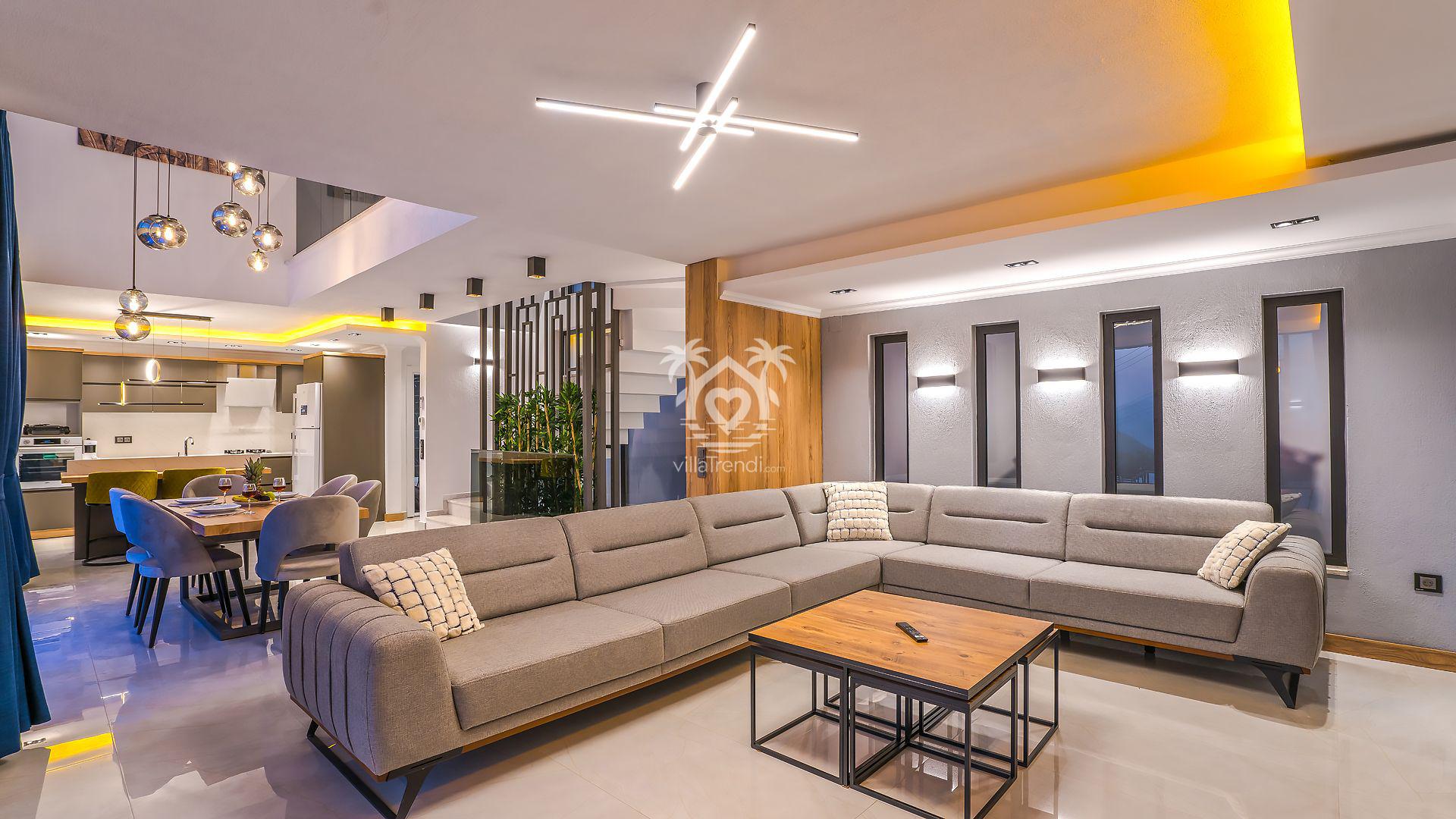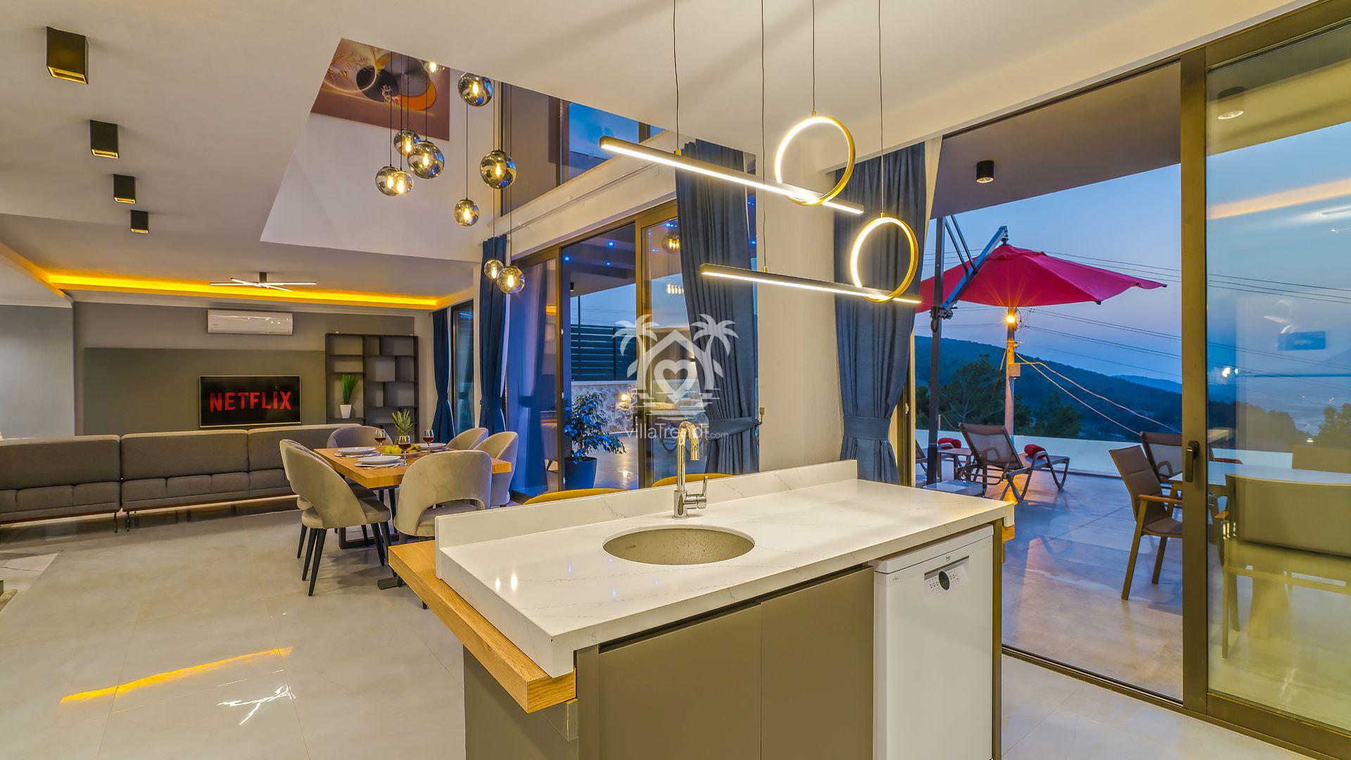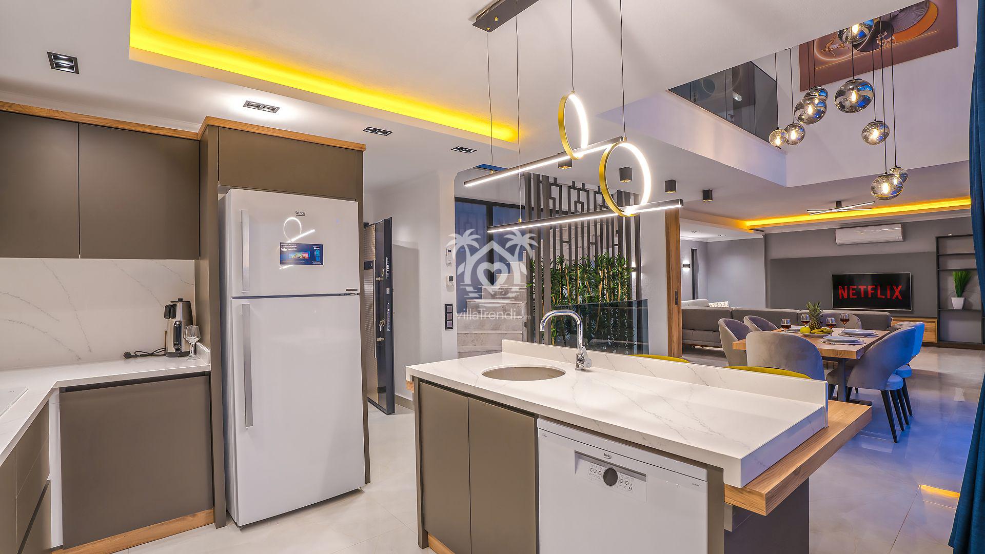 Salon & Mutfak: Modern dekore edilmiş salondan havuz terasına doğrudan geçiş mevcuttur. Eksiksiz dizayn edilen Amerikan mutfakta mikrodalga fırından tüm mutfak gereçlerine kadar her şey mevcuttur. 🛋️🍳