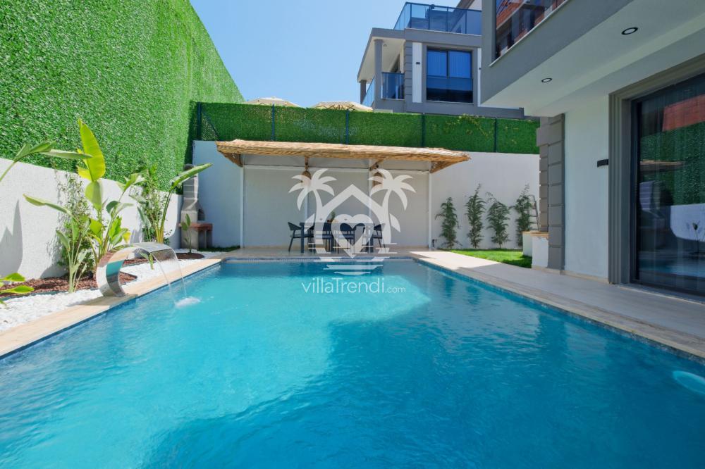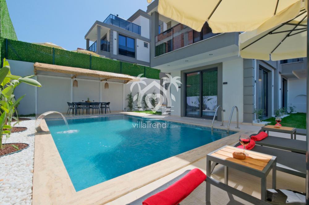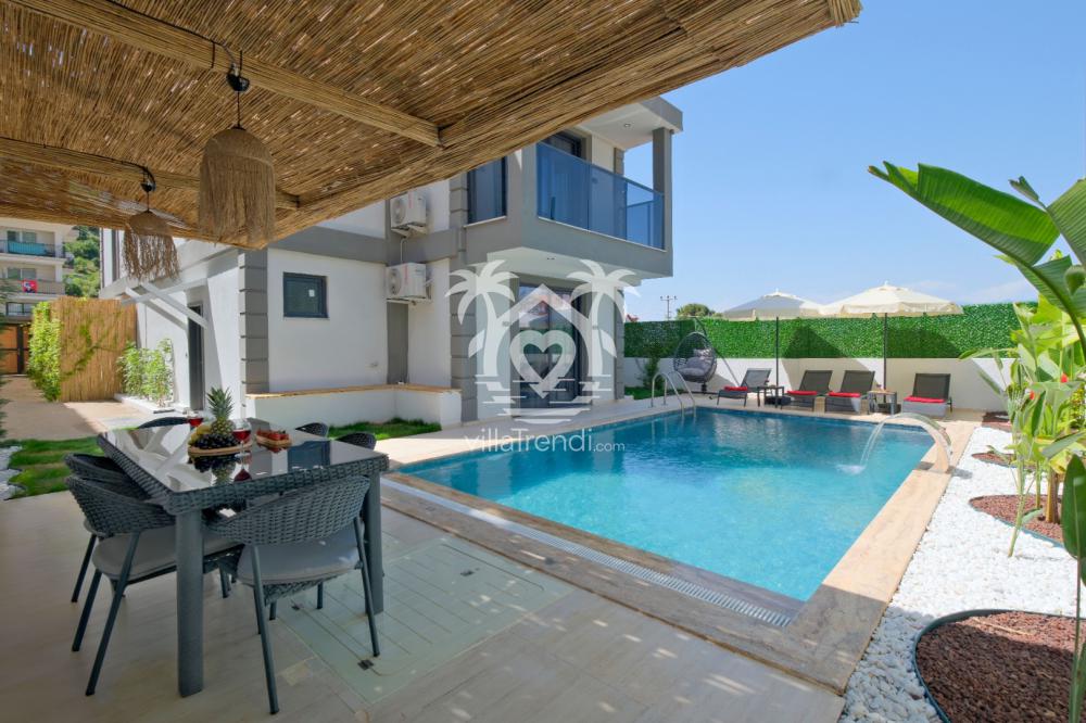 Villanın birinci yatak odasında çift kişilik yatak, jakuzi ve özel banyo; ikinci yatak odasında yine çift kişilik yatak ve banyo; üçüncü yatak odasında ise iki adet tek kişilik yatak yer almaktadır. Ayrıca salon kısmında ortak kullanıma uygun bir banyo bulunmaktadır. Konforlu oturma odası ve modern açık mutfak, havuz terasına doğrudan açılarak ferah ve kullanışlı bir yaşam alanı sunar. Havuz terasında ise şezlong takımı, oturma grubu ve barbekü alanı yer almakta olup misafirlerin keyifli vakit geçirmesi için her şey düşünülmüştür.