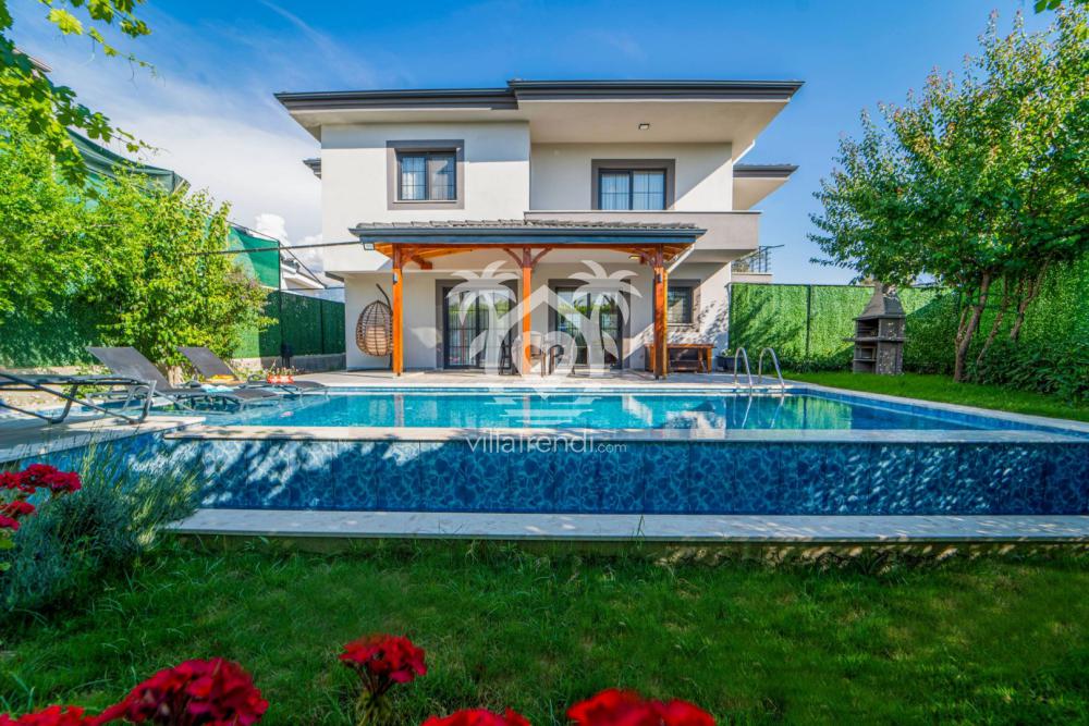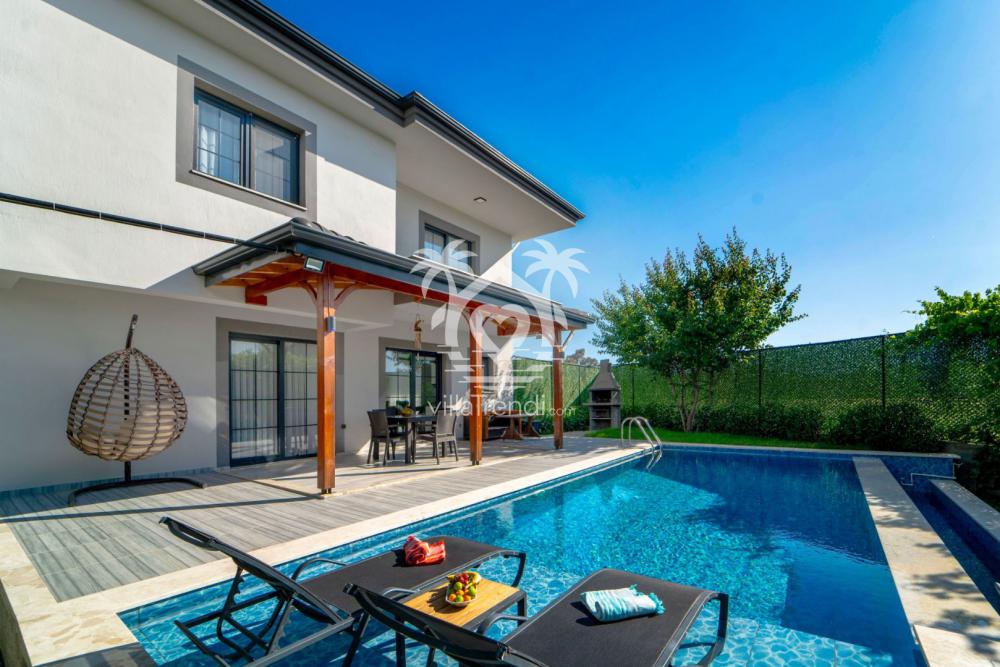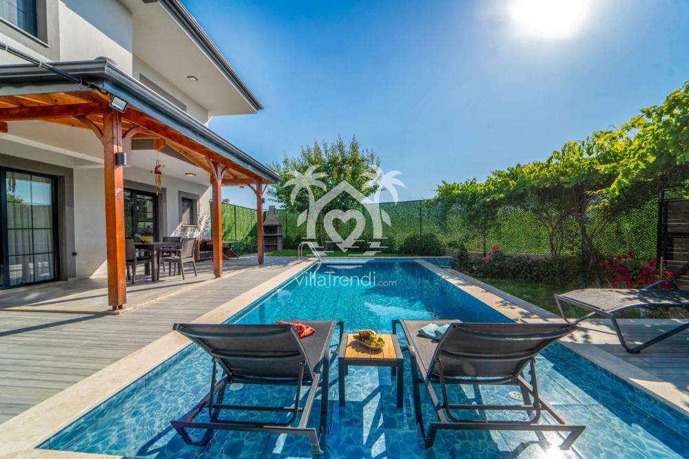 Tam Müstakil ve Korunaklı Tasarım: Villamız, tamamen size özel bir yaşam alanı sunan tam müstakil bir yapıya sahiptir. Dışarıdan görünmeyen, yüksek duvarlarla çevrili korunaklı özel havuzu sayesinde, ailenizle birlikte gözlerden uzak, özgürce yüzmenin ve güneşlenmenin keyfini çıkarabilirsiniz. Çocuklarınızın güvenle oynayabileceği geniş bahçesi de tatilinize ayrı bir keyif katacaktır.
