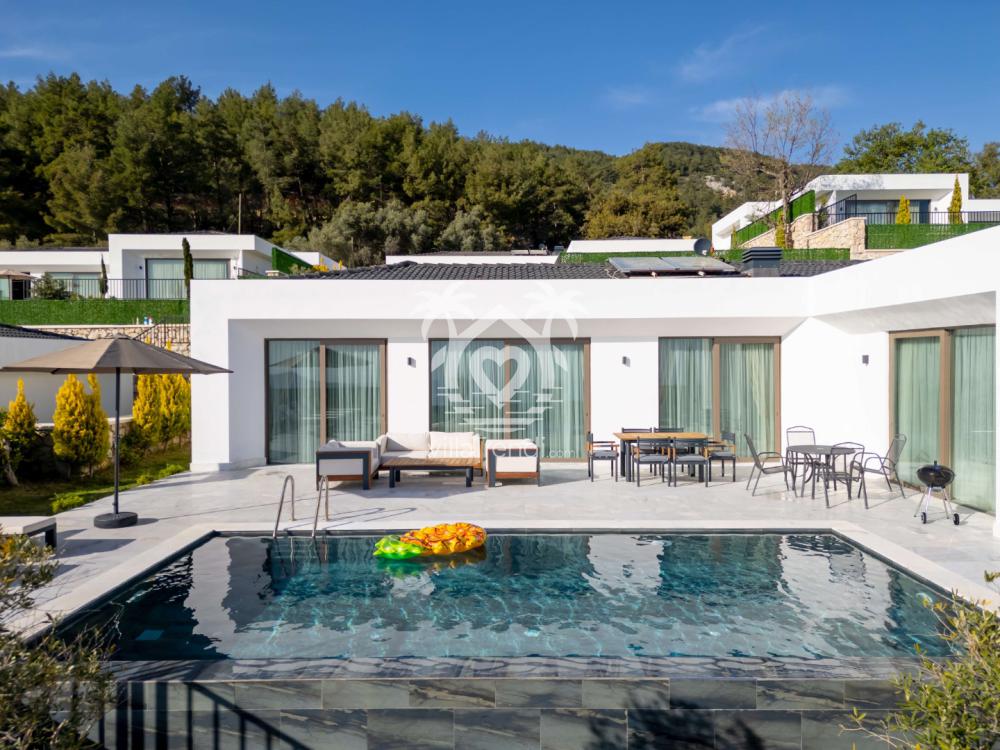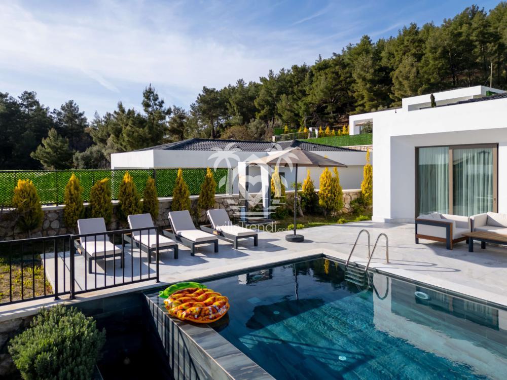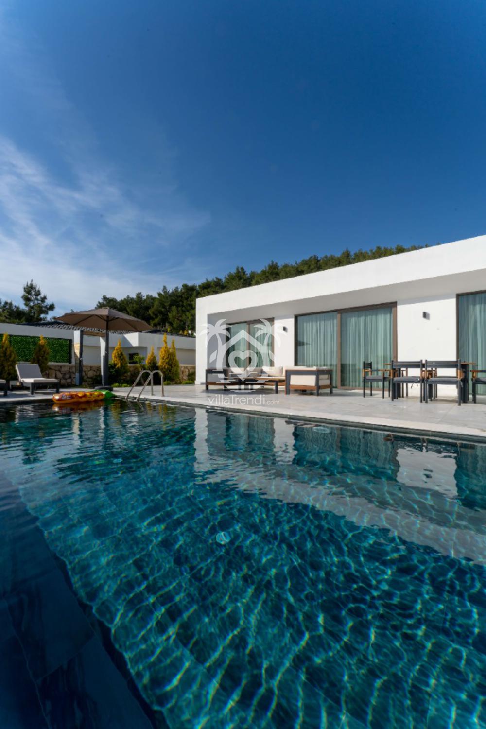 Villanın ihtişamını arttıran yüzme havuzu, masmavi atmosferiyle konukların günün her anında ferahlatıcı bir etkiye kavuşmasını sağlıyor. Şezlonglar yüzme keyfini destekliyor ister güneşlenip dinlenebilir ister miskinlik yapıp uyuyabilirsiniz. Şezlong takımı havuz ve doğa manzarasıyla dinlendirici bir etki yaratıyor.