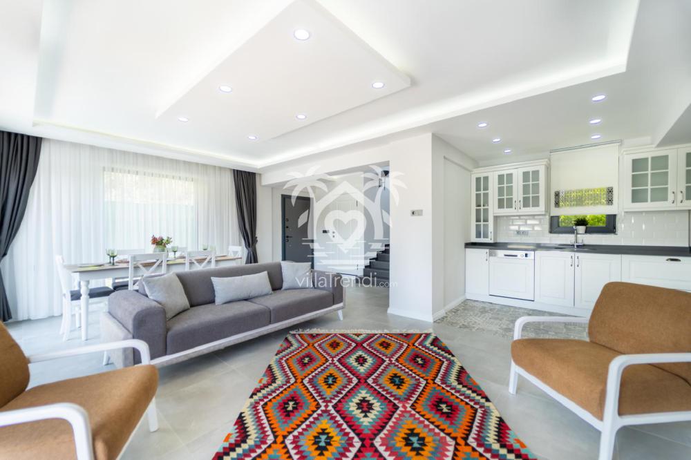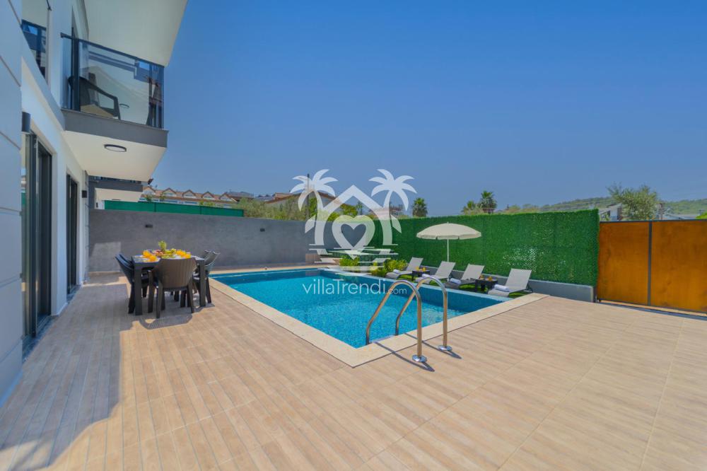 - Salon: Rahat oturma grubu, düz ekran TV, klima bulunur. Modern ve şık mobilyalarla döşenmiştir. Genellikle bahçeye veya havuz alanına kolay erişim sağlar.