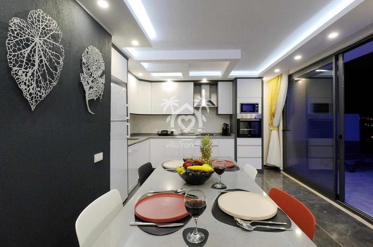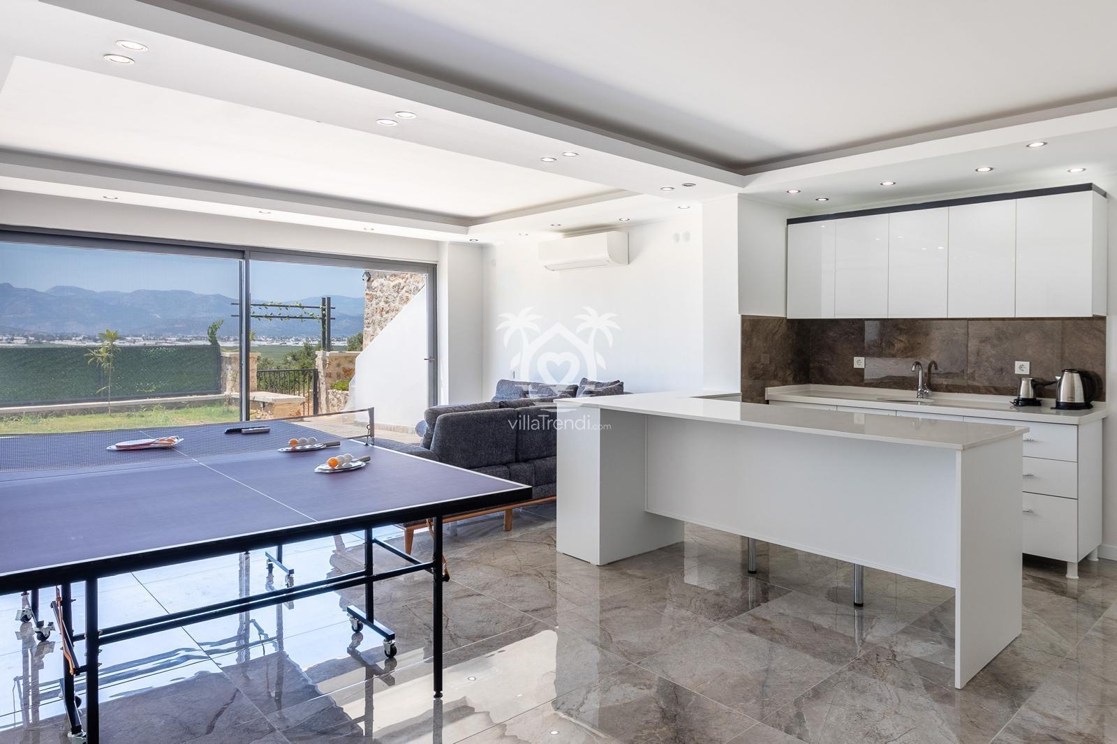 Yaşam Alanı: Doğrudan havuz terasına açılan ferah bir salon ve her türlü ekipmana sahip modern Amerikan mutfak. 🥘📺