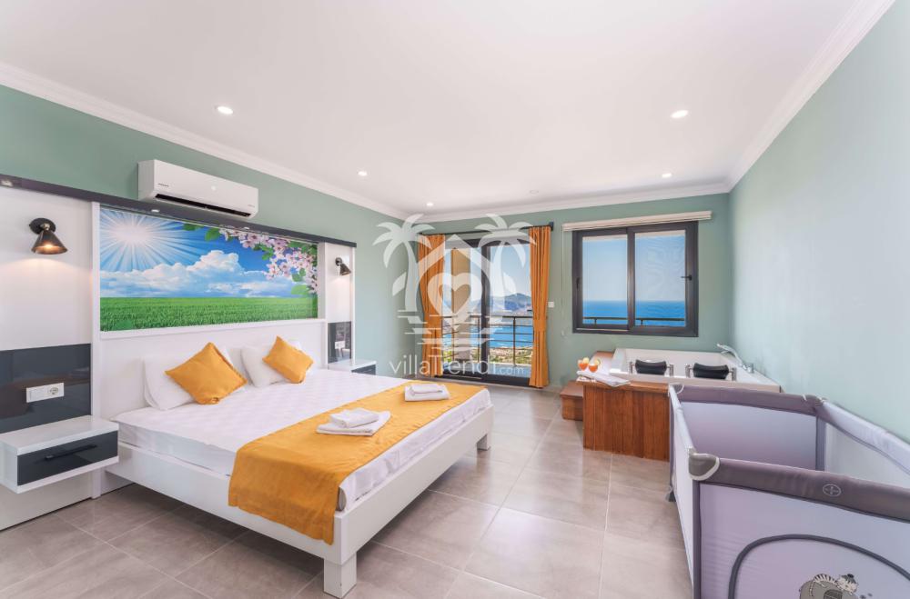 1. Yatak Odası: Çift kişilik lüks yatak, klima, jakuzi, komodin, makyaj masası, bebek park yatağı, geniş giysi dolabı, deniz manzaralı özel balkon, banyo ve tuvalet.
