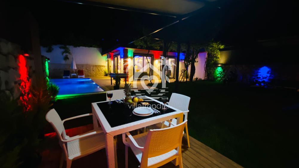 - Bahçe: Villanın özel bahçesinde, keyifli vakit geçirmeniz için langırt, çocuk oyun alanı ve dinlendirici bir salıncak yer almaktadır. Ayrıca, tam korunaklı özel havuzunuzda dilediğiniz gibi yüzebilir ve güneşin tadını çıkarabilirsiniz. Havuz çevresinde şezlonglar ve güneş şemsiyeleri bulunmaktadır.