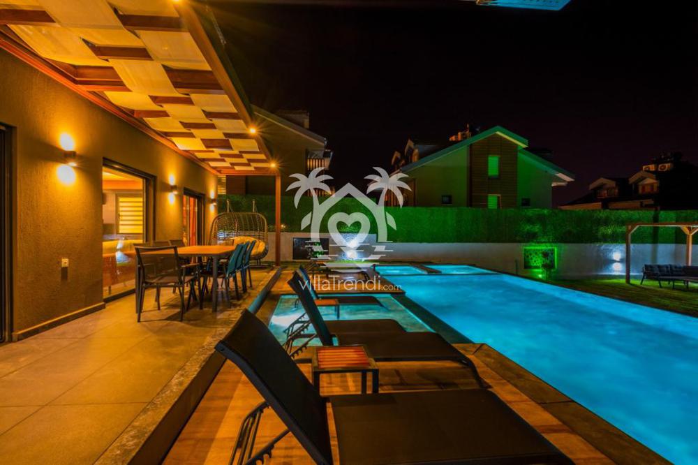 Havuzlu villa kiralama arayan misafirler için ideal bir seçenektir. Villa özel dikdörtgen havuza sahiptir. Havuz ölçüleri 11×7 metre ve 1.5 metre derinliktedir. Korunaklı yapısı sakin yüzme sağlar. Bahçe ışıklandırması akşam serinliğinde romantik ortam sunar. Ekibimiz her sabah havuz ve bahçeyi temizler. Bu sayede havuz suyunu ve peyzaj düzenini her zaman temiz tutuyoruz. Şezlong ve şemsiye bahçede rahatlama alanı sunar. Jakuzi ise günün yorgunluğunu atmanızı sağlar. Veranda doğa manzarasını izleme imkanı tanır. Bahçe oturma grubu ve barbekü bölümü keyif katar. Üstelik size bebek park yatağı ve mama sandalyesi temin edilir. Otopark alanı güvenli park imkanı sunar. Salon bölümünde oturma grubu ve TV vardır. Kablosuz modem aracılığıyla internet erişimi sağlar. Böylece bağlantı sorunuyla karşılaşmazsınız.