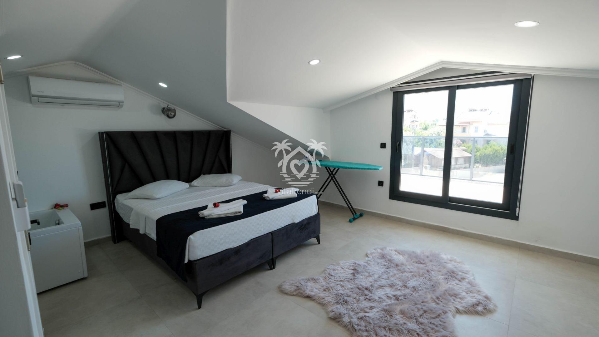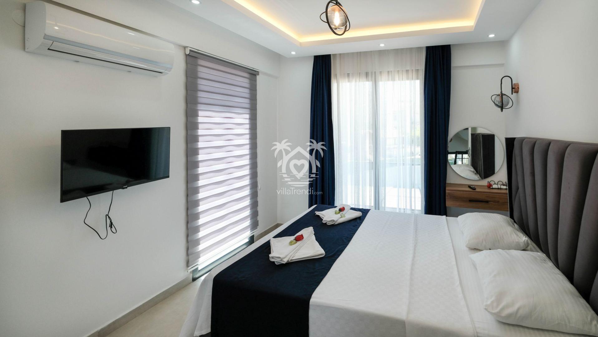 3. Yatak Odası: Çift kişilik yatak, TV, klima, balkon ve ebeveyn banyosu. 🛌🚿
