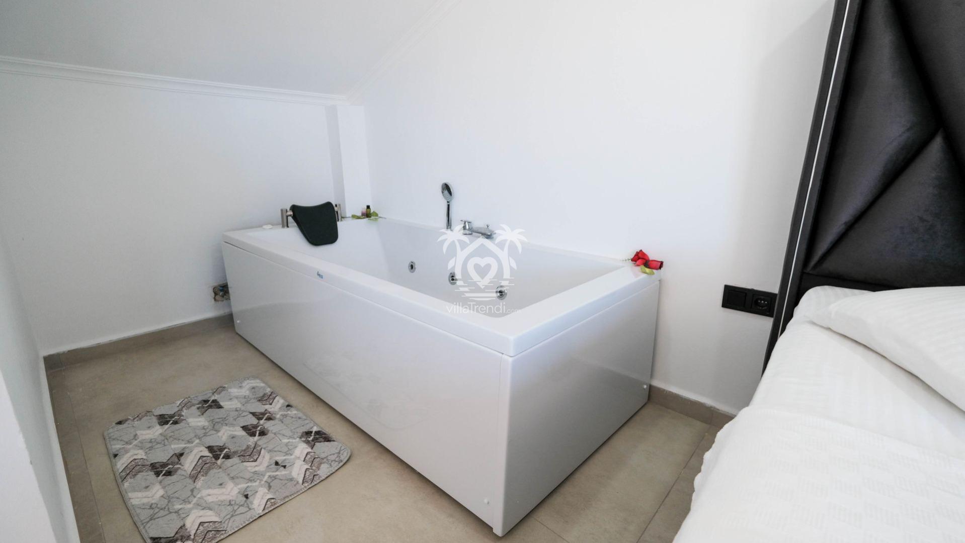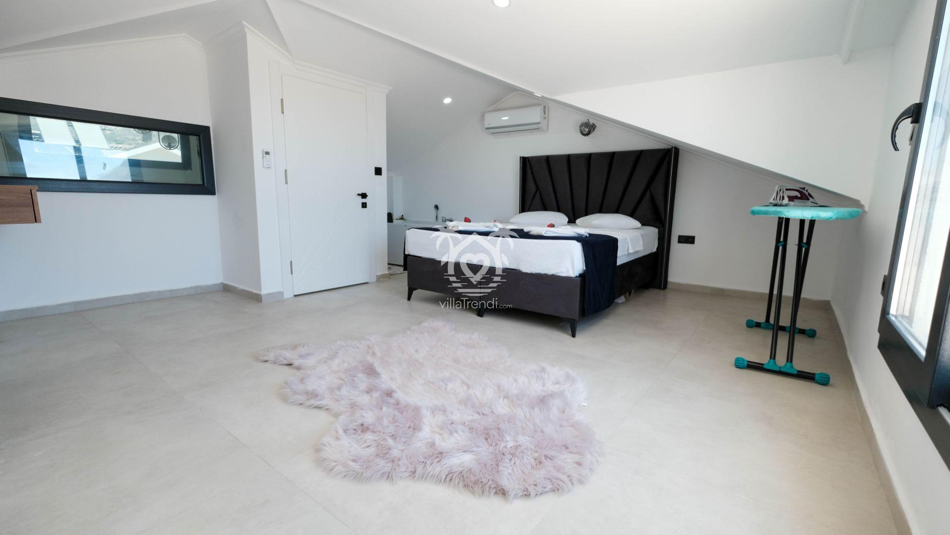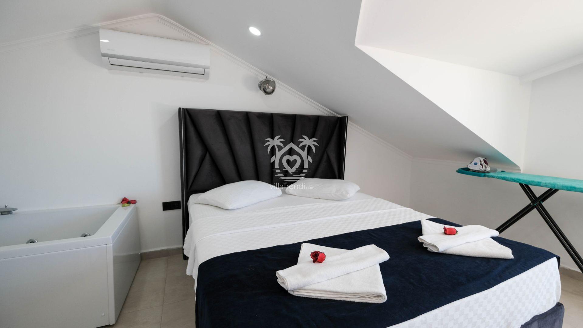 1. Yatak Odası: Çift kişilik yatak, tüm yorgunluğunuzu unutturacak özel jakuzi, klima, odaya özel balkon ve ebeveyn banyosu. 🛌🛀