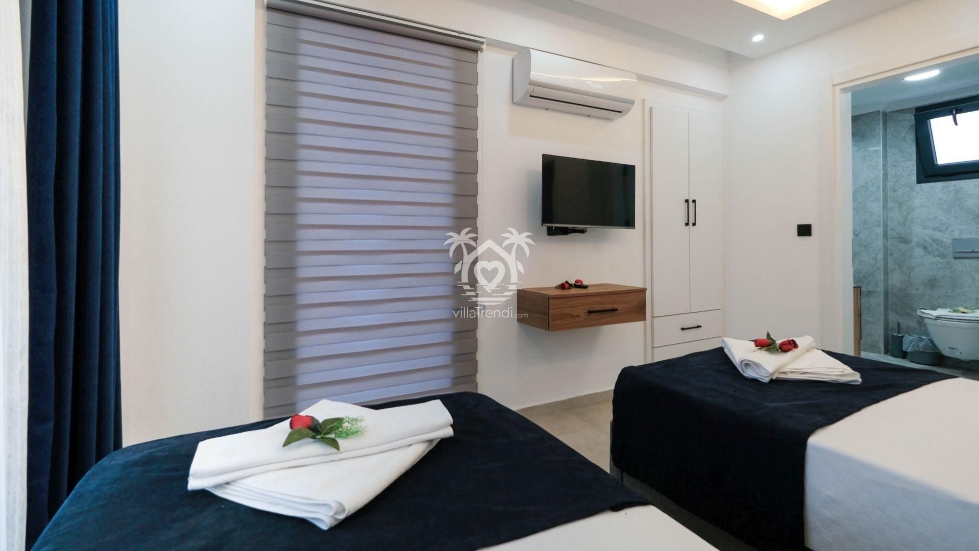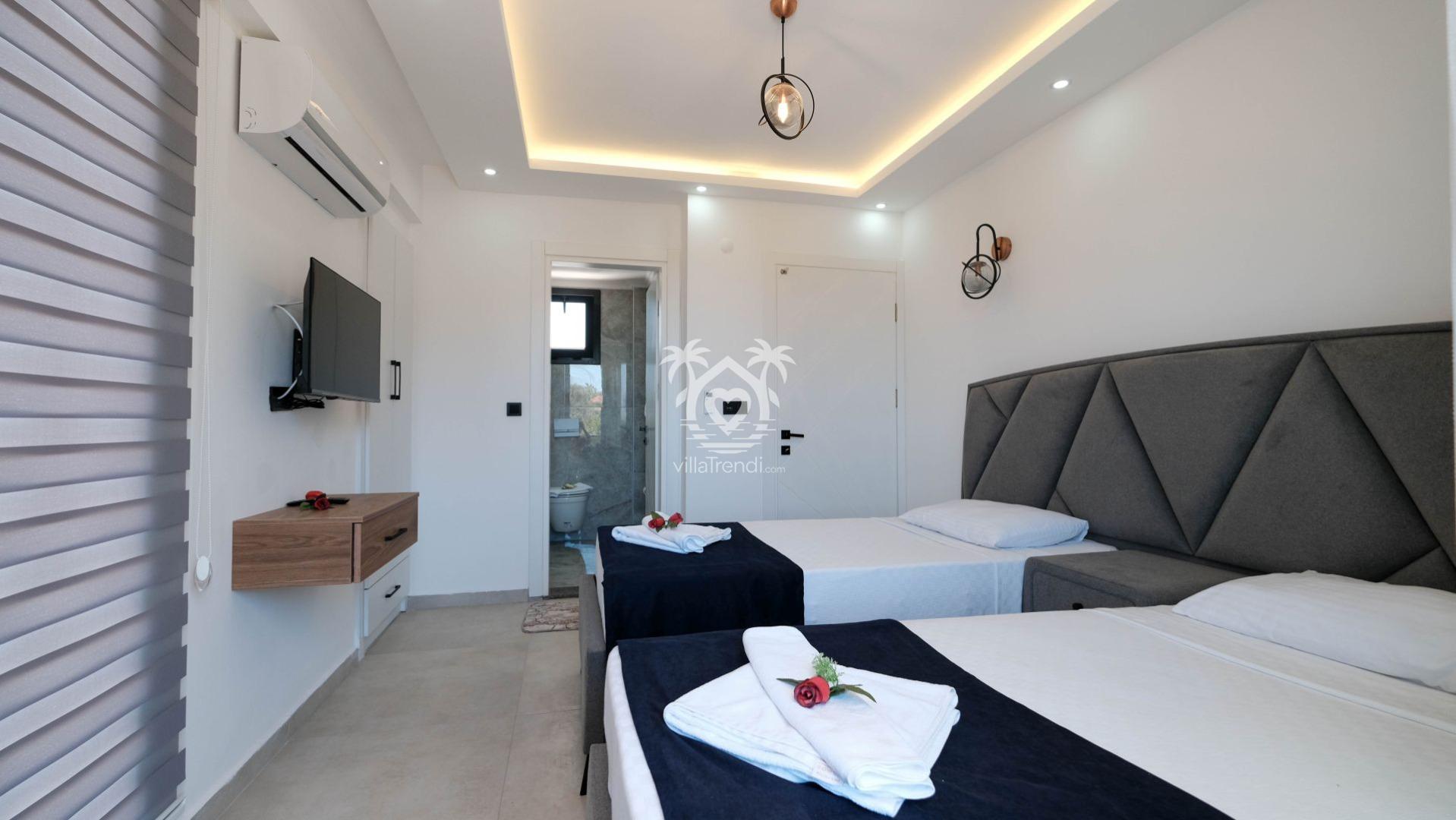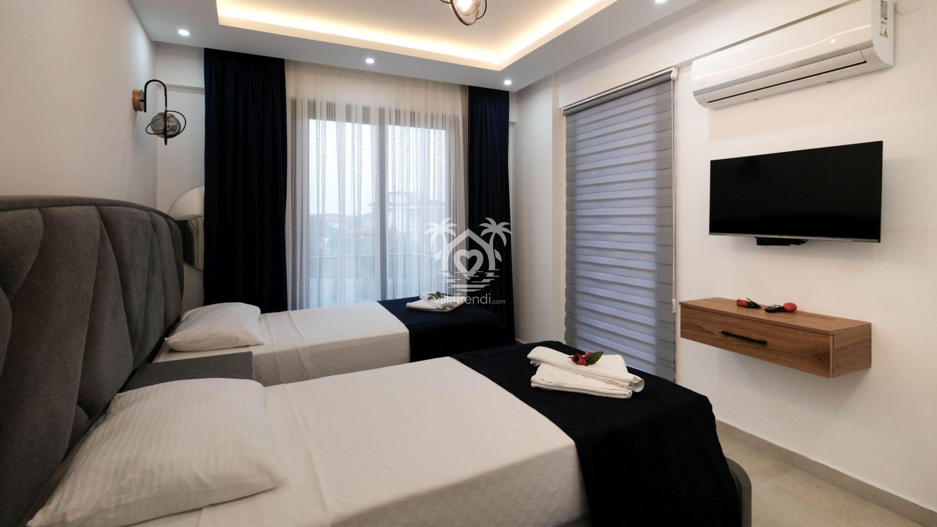 2. Yatak Odası: İki adet tek kişilik yatak, TV, klima, balkon ve ebeveyn banyosu. 💤📺