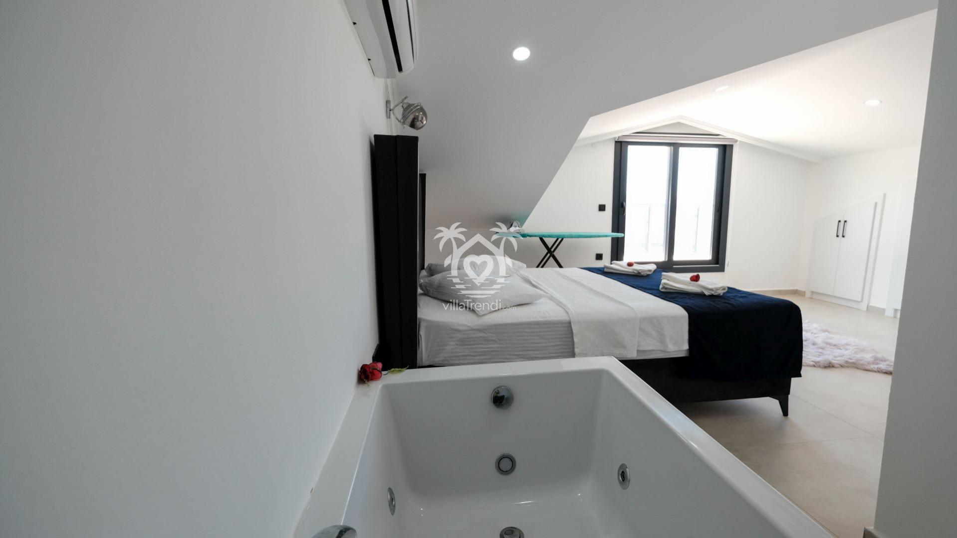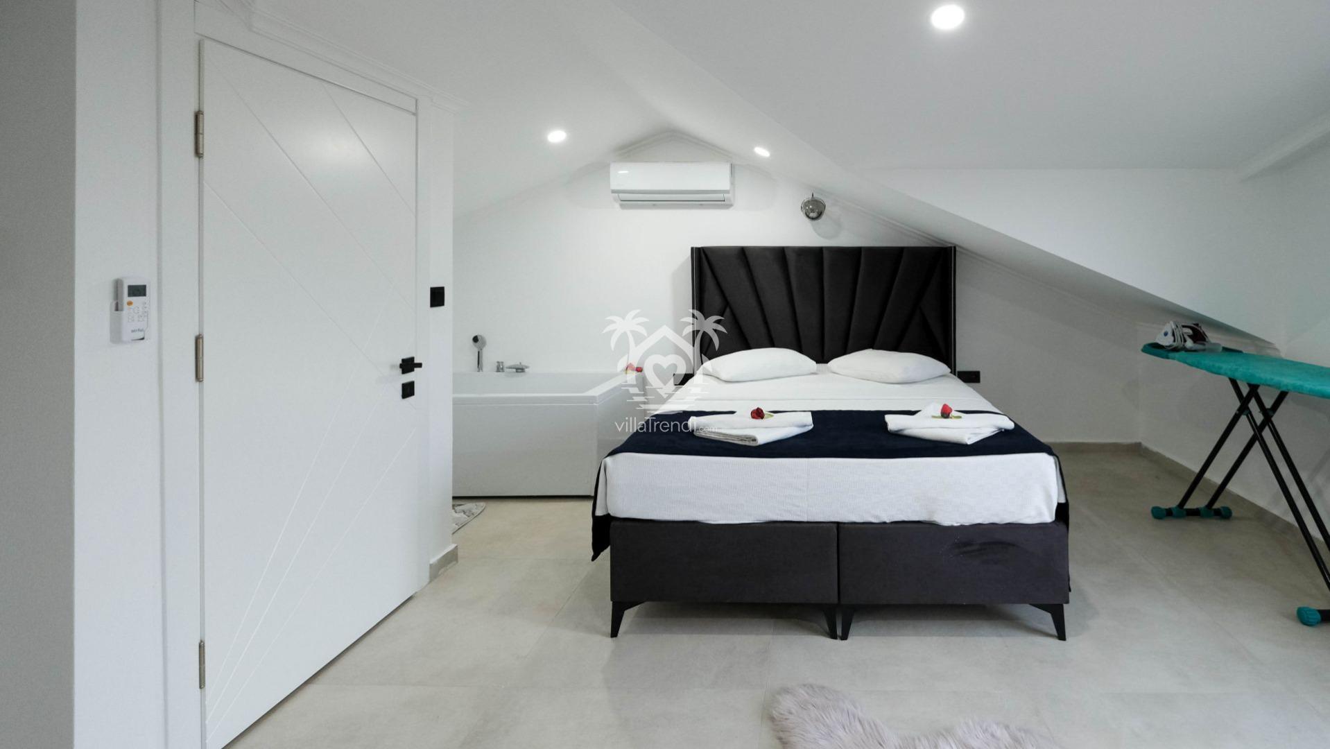 1. Yatak Odası: Çift kişilik yatak, yorgunluğunuzu atacağınız özel jakuzi, klima, balkon ve ebeveyn banyosu. 🛌🛀