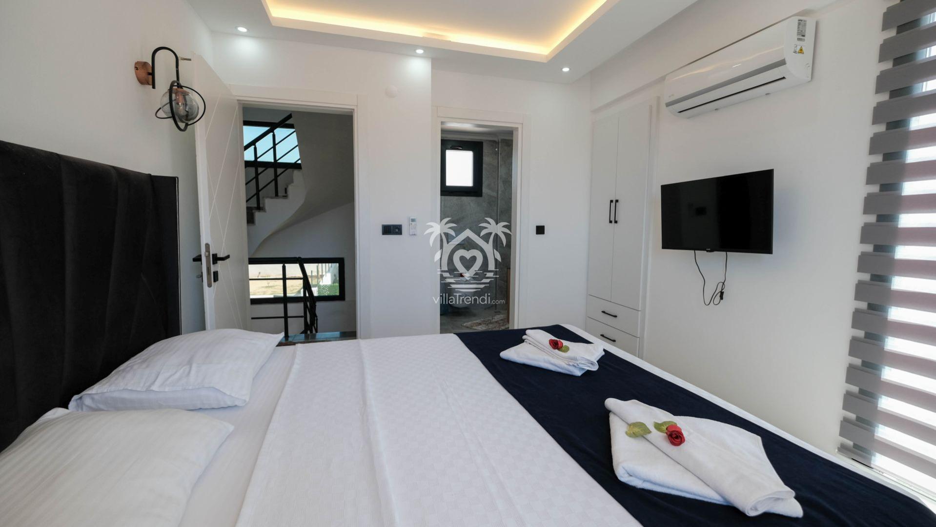 3. Yatak Odası: Çift kişilik yatak, TV, klima, balkon ve ebeveyn banyosu. 🛌🚿