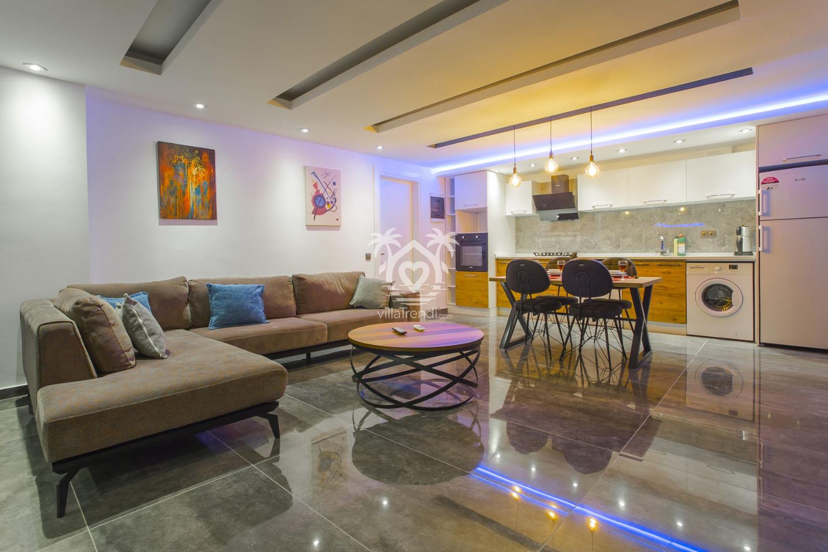 Modern Salon: Kaliteli oturma grubu, TV ve internet donanımıyla ferah bir yaşam alanı sunar. Salondan havuz terasına doğrudan geçiş mevcuttur. 📺🛋️
