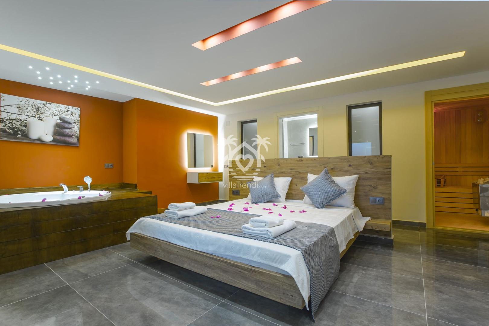 Süit Balayı Odası: Konforlu çift kişilik yatak, klima ve oda içerisinde yer alan lüks sauna ile jakuzi sayesinde kendinizi şımartın. 🛀🧘♀️