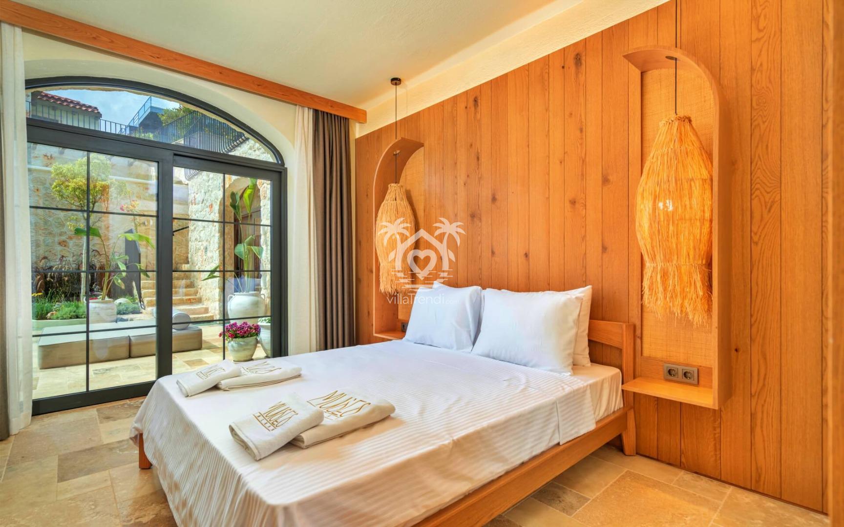 Kalkan merkezinde yer alan Villa Myros, 4 kişilik minimal fakat zengin bir konfora sahip.