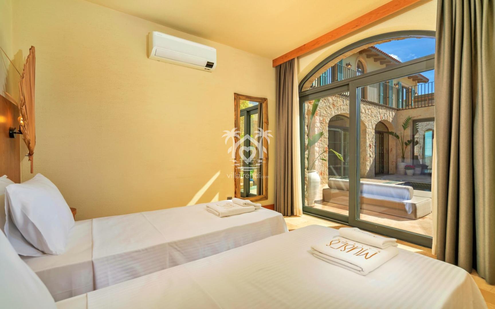 Süit Konaklama: Tamamı ebeveyn banyolu, klimalı ve özel tasarım mobilyalarla döşenmiş 5 yatak odası (4 çift kişilik, 2 tek kişilik yatak). 🛌🚿