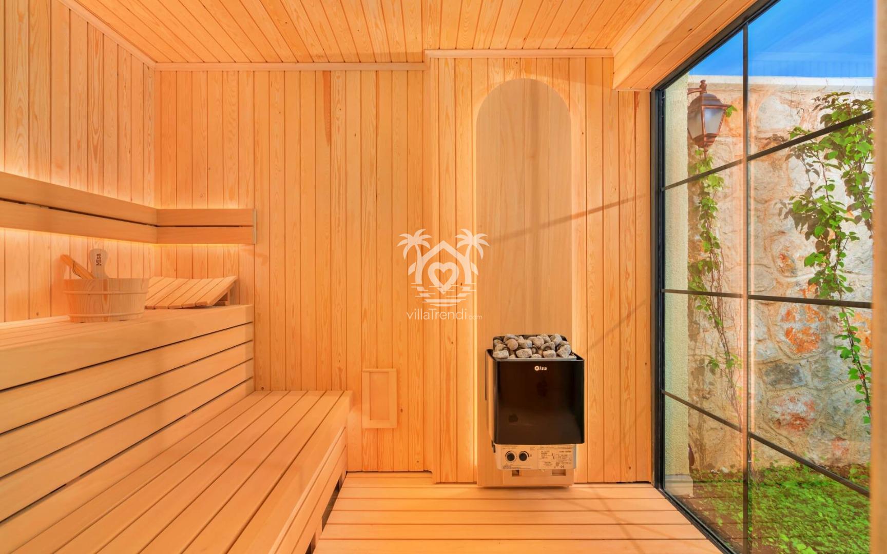 Hobi & Keyif Alanları: Orijinal Sibirya çamından yapılmış özel sauna ve 65 inçlik Android TV ile donatılmış sinema odası tatilinize keyif katar. 🎬🧖♂️