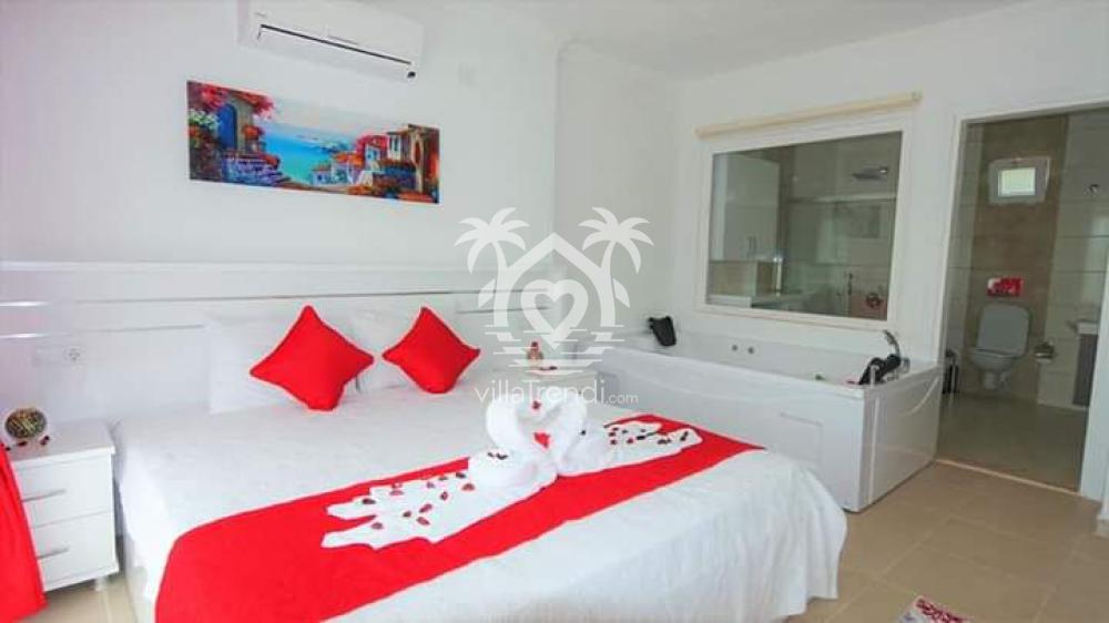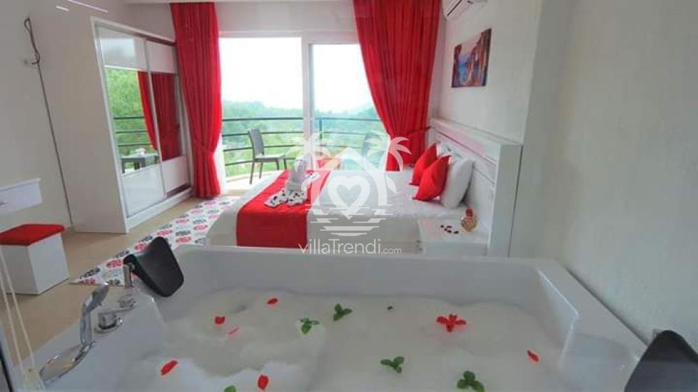 - 1. Yatak Odası: Lüks detaylarla bezeli bu odada çift kişilik konforlu bir yatak, serinletici klima, kullanışlı bir kıyafet dolabı, zarif bir makyaj masası, iki adet şık komodin ve rahatlatıcı bir jakuzi bulunmaktadır. Ayrıca özel banyo ve tuvaletiyle balkona açılmaktadır.