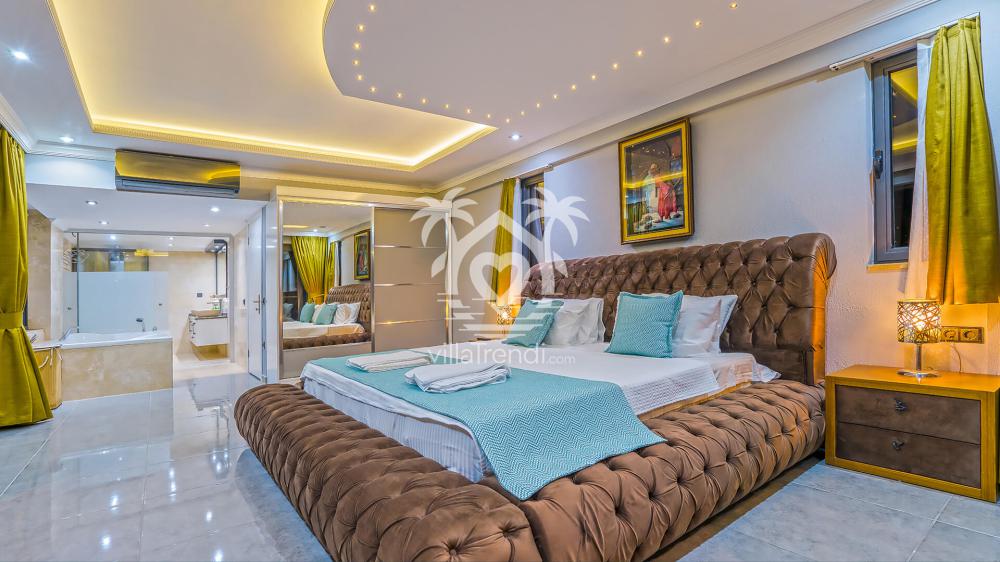 Yatak odalarının her birini özenle tasarladık. Birinci odada çift kişilik yatak, komodin, makyaj masası ve en-suite banyo bulunur. İkinci bölümde iki tek kişilik yatak ve özel banyo vardır. Üçüncü oda çift kişilik yatağıyla huzurlu bir uyku alanı sağlar. Dördüncü kısımda ise jakuzi, klima, TV ve elbise dolabı yer alır. Böylece her misafir lüks bir konaklama deneyimi yaşar. Aynı zamanda iki ayrı salonumuz, oturma grupları ve televizyonuyla keyifli anlar yaratır. Tüm alanları aktif şekilde kullanan konuklar, tatil boyunca kendilerini evindeymiş gibi hisseder.