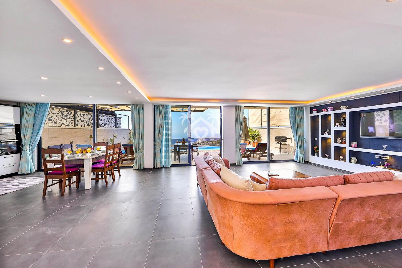 Deniz manzaralı Villa Sunshine, 6 kişilik geniş konaklama kapasitesiyle Kalkan’da, Kördere’de yer alıyor.